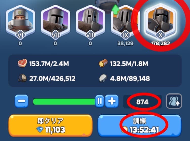 普段は2番目に強い兵士(troops)を訓練して総数を増やしていく