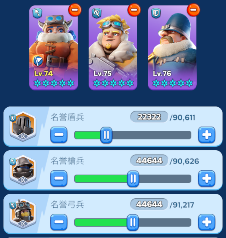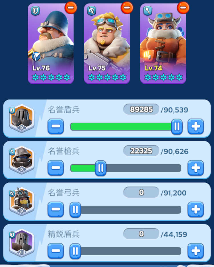 ・弓(Marksman):槍(Lancer):盾(Infantry)=4:4:2の割合で部隊編成