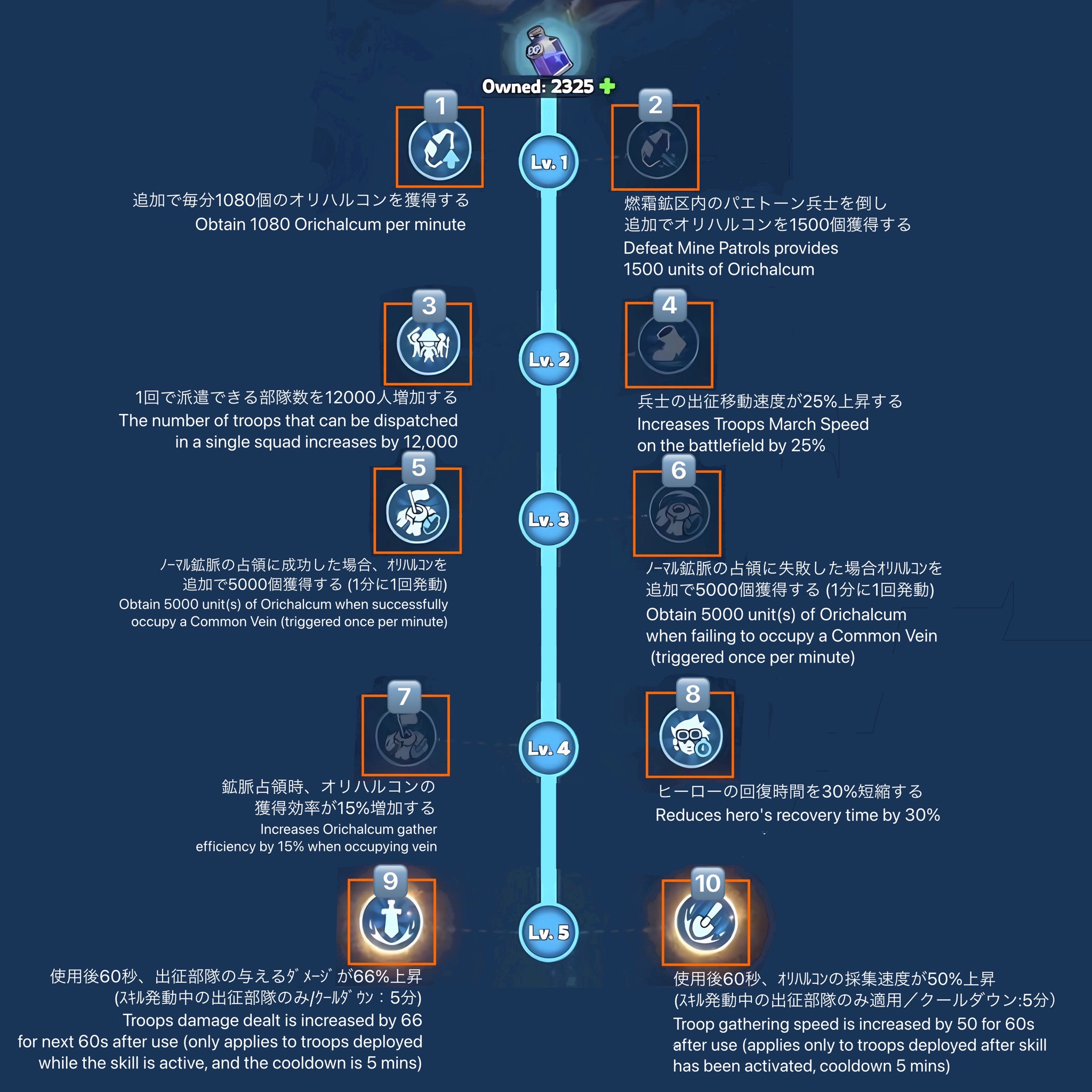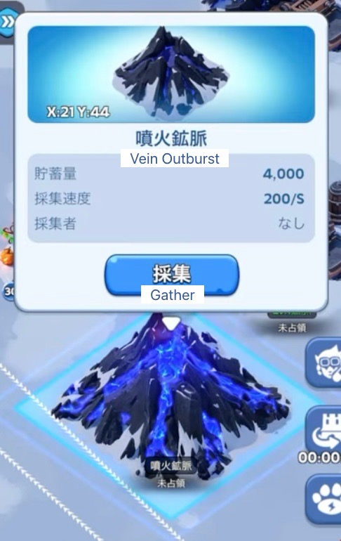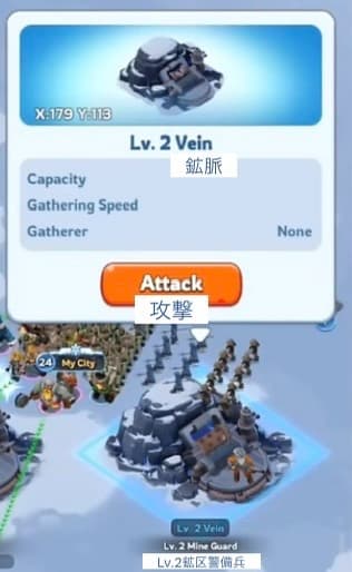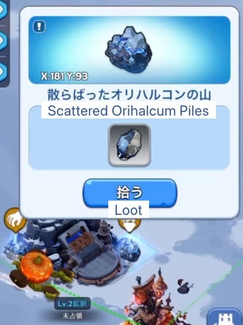 鉱脈の警備兵or採集中の行軍を攻撃すると、オリハルコンの欠片がドロップする。別枠の行軍スロットで1部隊ずつ派遣可能