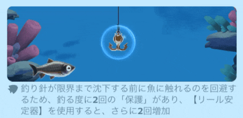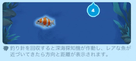 釣り針回収時に、レアな魚(★4以上)までの距離と方向を表示。魚にある程度近づかなければ表示されないため、注意しましょう。