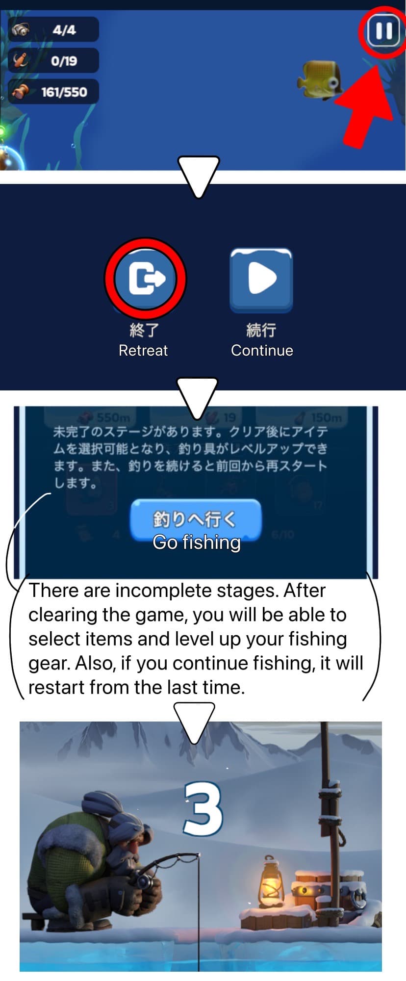 ※ゲームをやり直した場合、レアな魚(★4以上)、レアなアイテム(★3)、レアな潜水士(★2)は維持されます。そのためやり直し後も同じ魚が出現します。