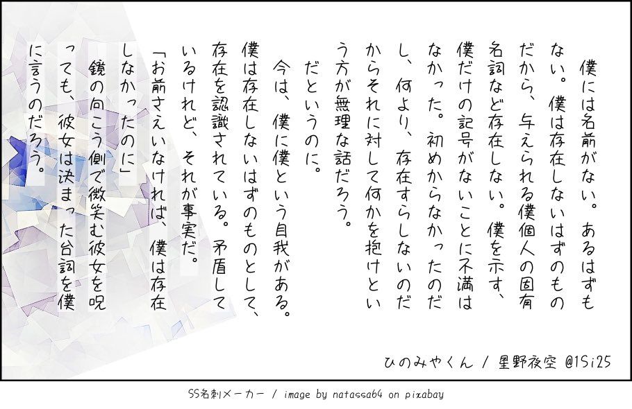 彼は彼女とは正反対に位置する鏡越しの存在。故に、彼に世界はない。彼には何もない。彼女が在るから存在した彼は、彼女を憎み、呪って言葉を吐く。彼女が人を愛して赦す限り、彼は人を憎んで呪うだろう。