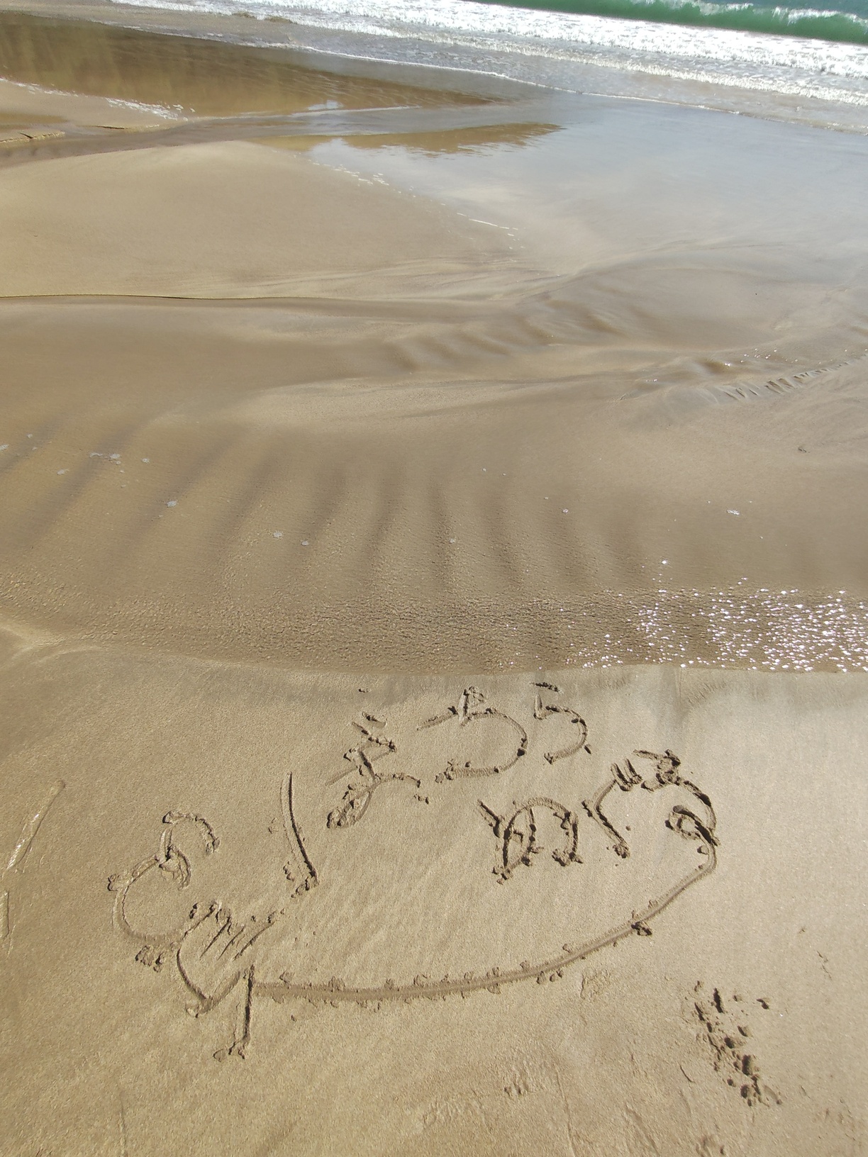 砂浜に蜂楽くんのサインを描いて遊ぶ🐝