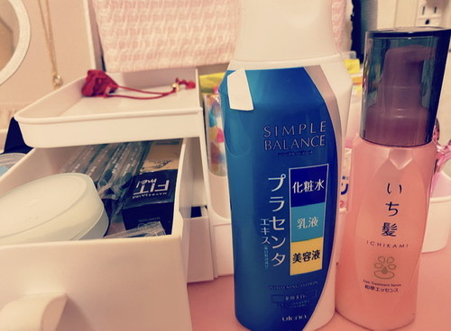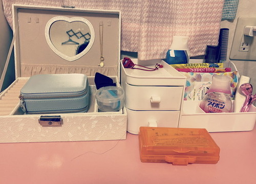 ベッドの横のドレッサー的なものです。ここには化粧品とスキンケア類、ジュエリーボックスには宝物が入っています。この桐箱はなんでしょー!当てたら凄いっっ!!