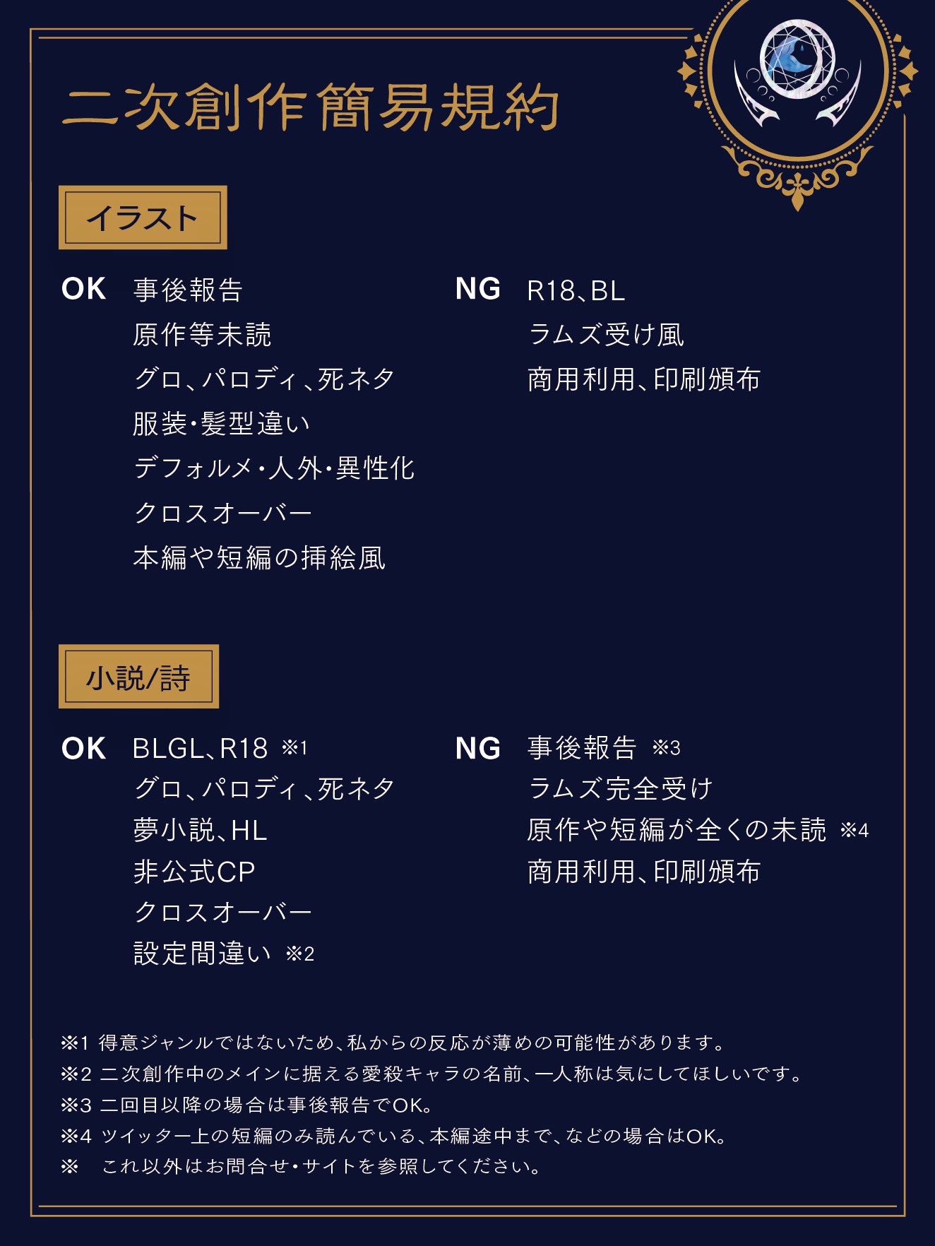 ※規約には厳しい言い方で書いておりますが、基本私は緩いです。よほどのことがなければ怒ったりしません。普通に皆様問題なく創作されていますし、あくまで保険で書いているだけです。