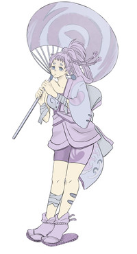 (親分Hnmrごん♀)火消しの団扇持ちの女性。