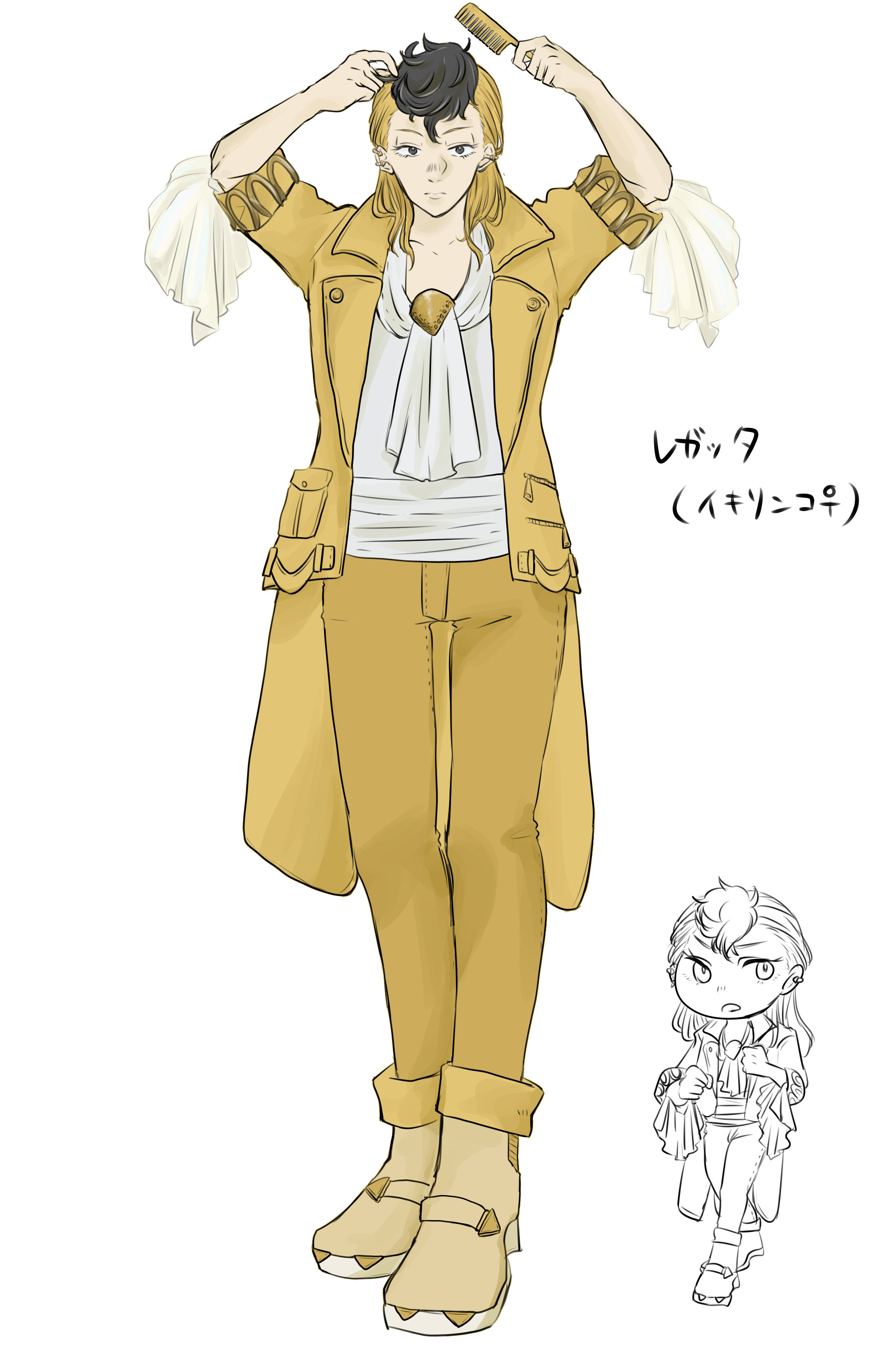 レザージャケットにジーンズとブーツ、とまるでフリシアの隣に並ぶのにはチグハグな格好を好むが、当のフリシアにせめてもとフリルの着いたシルクのブラウスを着せられており、まるで着せ替え人形だと不服を見せている。