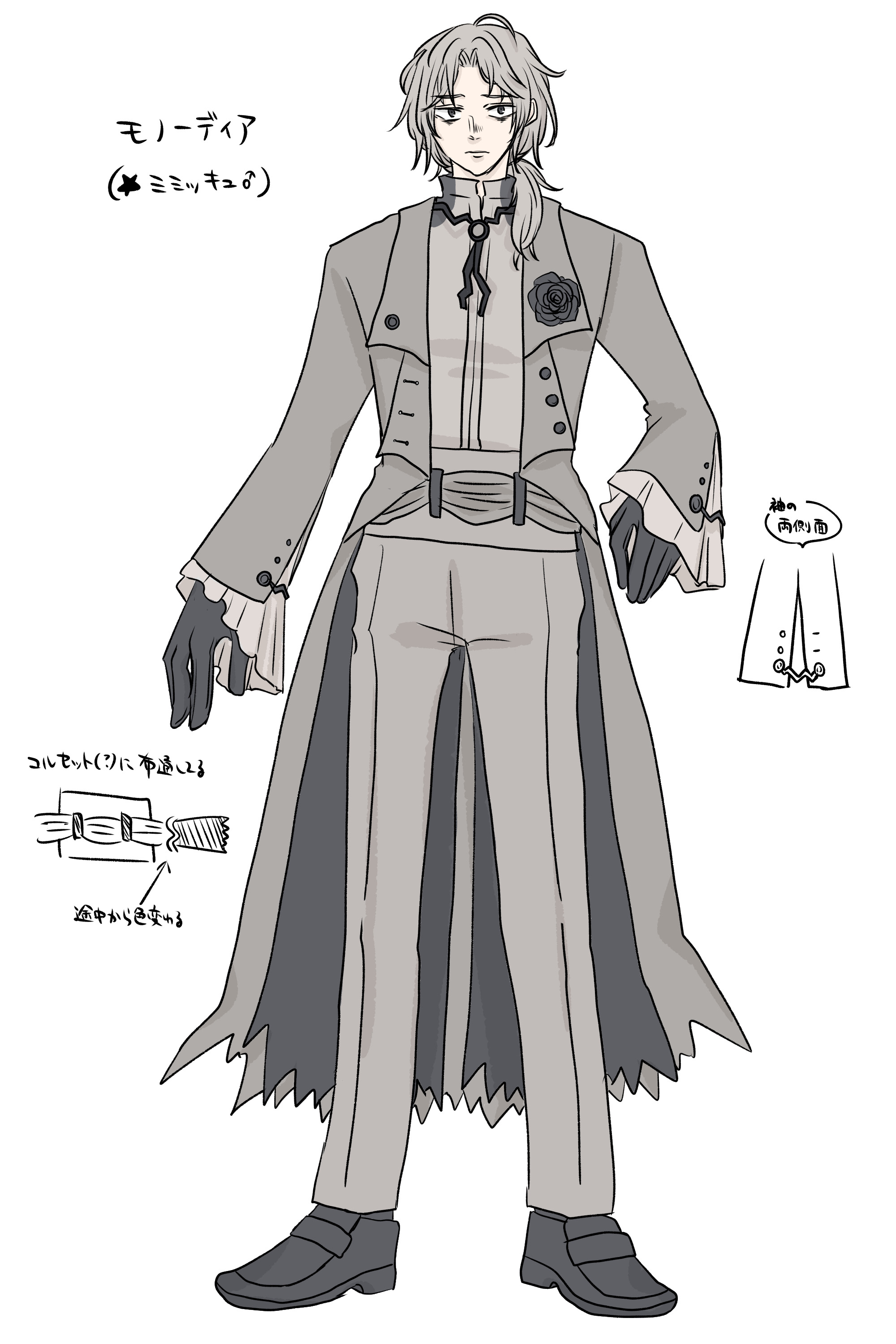 人形が着ているのは埃と煤に塗れた灰色のドレスだったが、モノーディアは昔愛した者を亡くしたショックで世界の色を失っている。彼自身はそれに気付いていない。