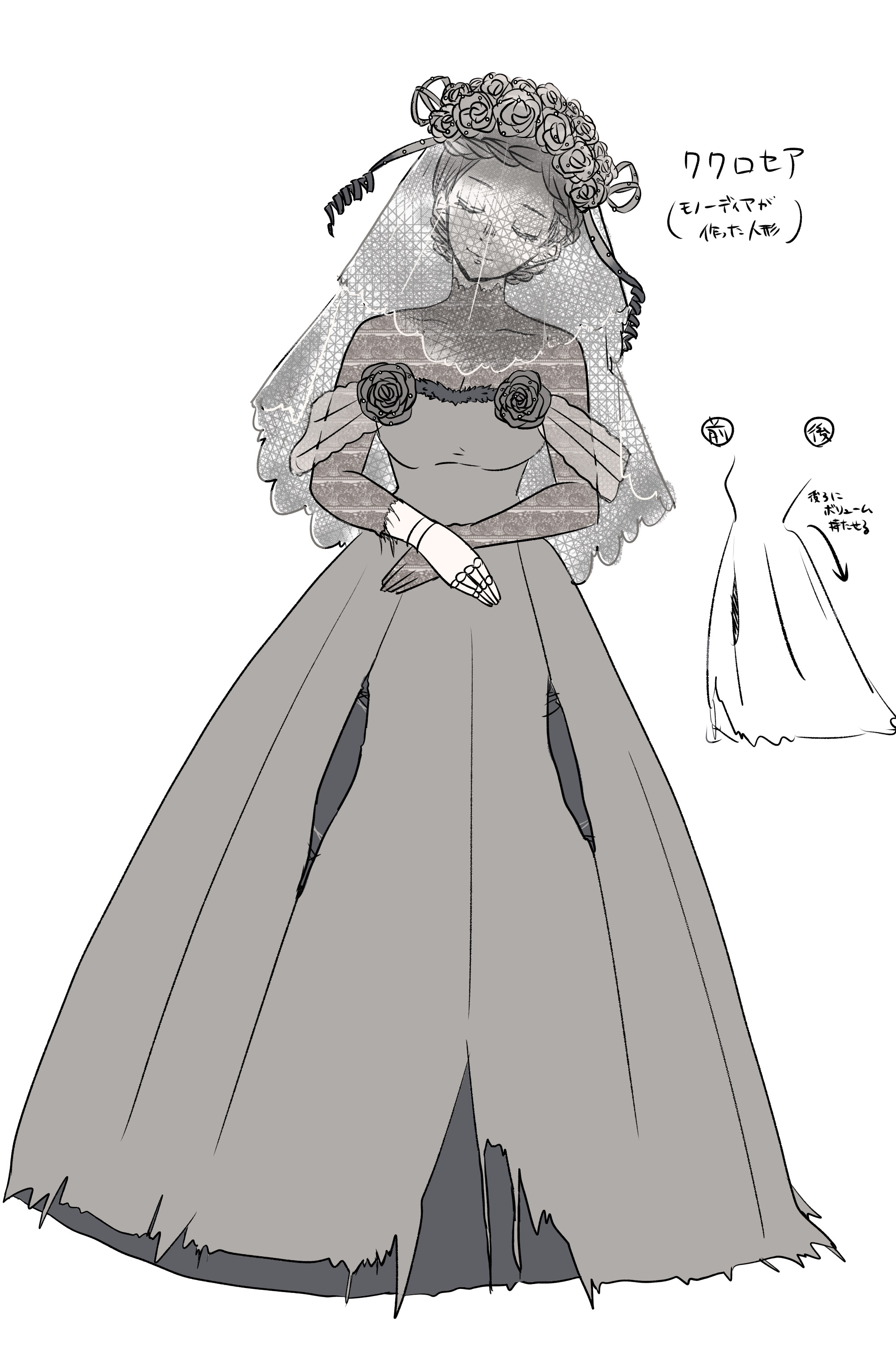モノーディアによって造られた球体関節人形。昔愛した人を亡くした時、必死の思いで作り上げた愛した人にそっくりな人形。花嫁衣裳のようなものを着ているがボロボロで不気味。埃まみれで灰色なその姿をモノーディアはよく褒めている。小首を傾げたようなポーズで止まっている。