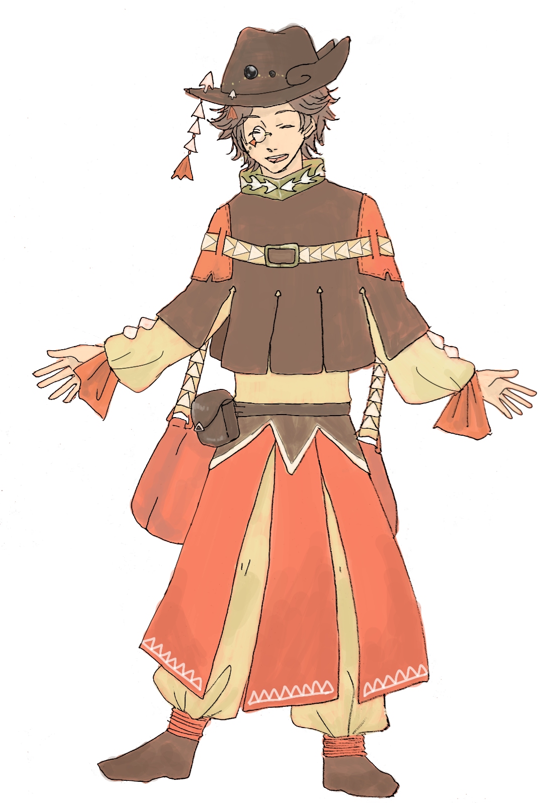 いつもニコニコしていてそれが胡散臭い男だが、実は目付きが悪いのを気にしており、それが商売に支障をきたすと思っている為笑みを絶やさない。
