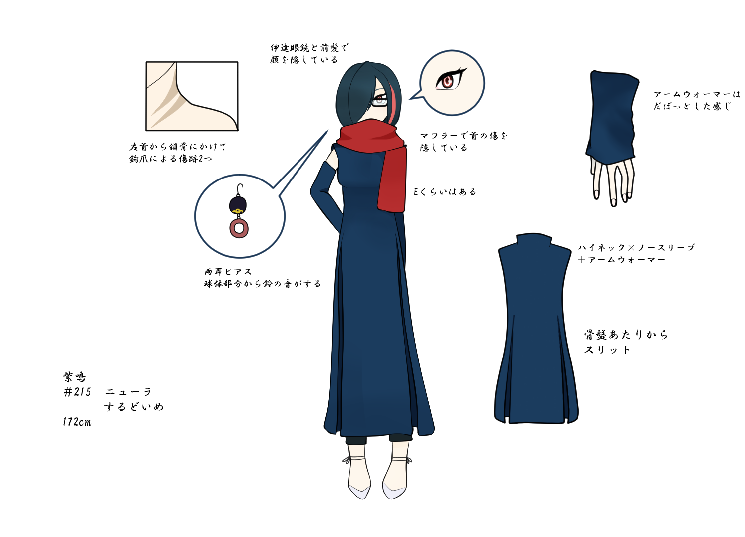 清水のもとで働くよううになった際にもらった鈴のついたピアスを身に着けている。普段は鳴らないが、トランス状態に入りかけると澄んだ音が響くようになる。バトルで興奮すると自分を御せない紫鳴の意識を繋ぐお守りのようなもの。