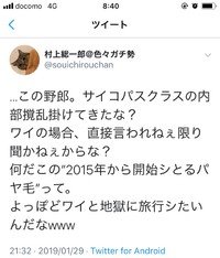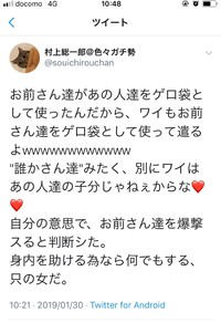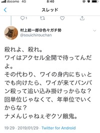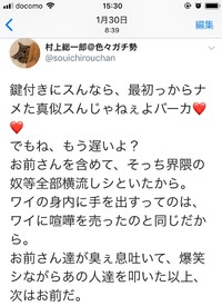 スクショまとめ(村上) --その他脅迫煽り、中傷名指し(HN.個人特定) 2019/01/29 18:47 2019/01/29 19:29 2019/01/29 21:32 2019/01/29 22:14 2019/01/30 06:40 2019/01/30 06:52 2019/01/30 08:39 2019/01/30 10:21 2019/01/31 06:33 2019/02/02 10:48 前次