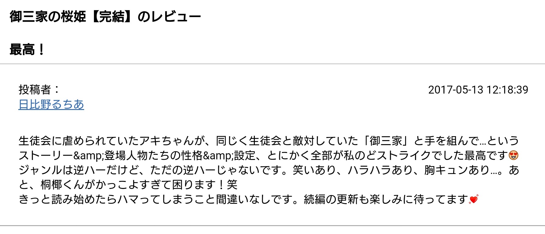 日比野るちあさん、御三家の桜姫にレビューありがとうございます!
