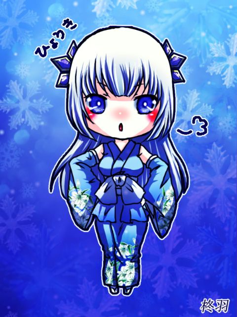 また、勝手に描かせていただきました!! 夜さんへの一枚目。 夜さんのお子様、氷姫さんです!! ツンデレな雪女さん。 腰に手を当てて、『まったくもう!』な感じを表現してみました。 雪女ということで、青を基調に結晶を散りばめてみました。
