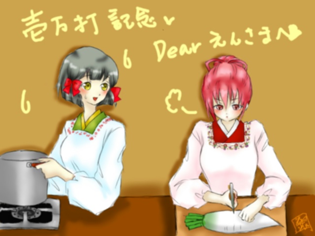一万打記念コラボ、えんさまのお子様の環ちゃんと我が子の湊で、《お料理練習!》というシチュエーションで描かせていただきました。 包丁を手に、鬼気迫る湊に若干引き気味の環ちゃん。 刀の扱いには慣れている湊ですが、包丁は別のようです。 えんさま、企画ご参加有難うございました!!