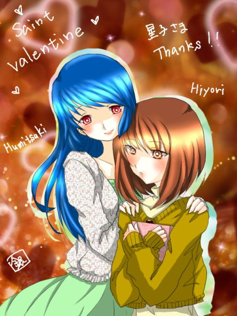 バレンタイン企画、星子さまへお礼に描かせていただいたイラスト。 なんと、文月に一票いれていただきました!ので、星子さまのお子様、日和ちゃんと文月とのコラボを描かせていたきました。 もしかしたら日和ちゃん、イメージとだいぶ違うかもしれません。違っていたらすみません…;; 文月も人間Versionで描いてみました。と言っても髪を下ろして服を着替えただけですが。 今回は企画にご参加いただき、ありがとうございました!!