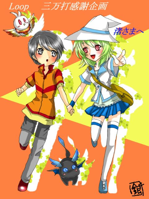 二枚目は Bツバサくんとリラちゃんのカップリング リラちゃんがツバサくんをグイグイ引っ張っていくイメージがありまして、こんな構図になりました。 酷く頭でっかちになってしまい、バ、バランスが……;; もう、土下座します。はい。 ごめんなさい〜!! 宜しければ、どうぞお持ちください。 渚さま、参加いただきありがとうございました!!