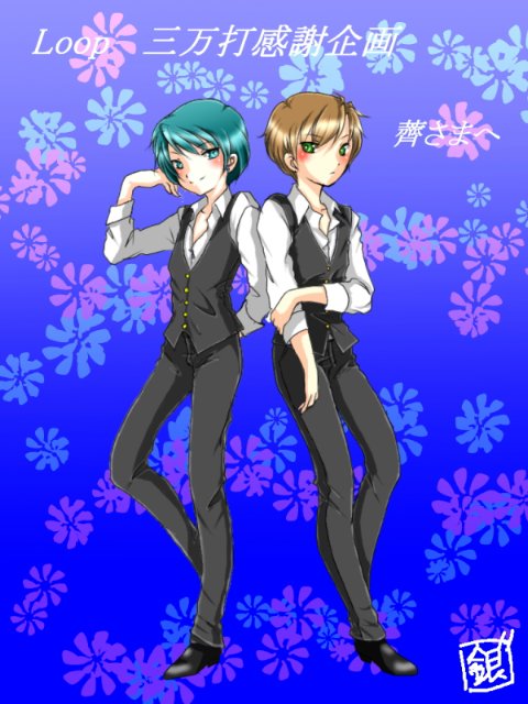 二枚目は、 B神無さんと四乃さんでシチュはお任せ。 構図がなかなか思いつかずに、またこの背中合わせに逃げる私;; でも、私的には気に入っています。 カフェの従業員という事で、ウェイターの格好をしていただきました。(神無さんはパティシエです;) お二人共、本当にイケメンでして…描きながらドキドキしていました…;; 薺さま、こんなお二人で宜しければ、どうぞお持ち帰りください。 今回はご参加いただきありがとうございました!!