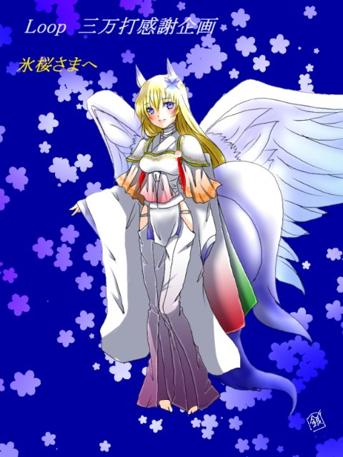 三万打企画にご参加いただきました、氷桜さまへ。 A安倍朔夜ちゃんに霜月のコスプレ 安倍朔夜ちゃんの神化状態のコスプレです!! 耳としっぽの先が青いという事なので、影に少し青を入れて、翼も水色を入れてみました。 翼としっぽが…かなり不自然な出来になりました。 もっとフサフサした感じを出したかったのですが…………;; 氷桜さま、よろしければお持ち帰りください。