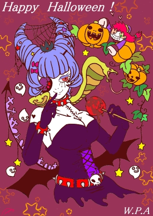 わさぴーさまよりハロウィンフリイラをいただきました!! 悪魔のコスプレをしたバクちゃんと、カボチャと戯れるエンマさんです!! いつもながらポップな絵柄や色使い、お見事です!!見ているだけで楽しくなります!! わさぴーさま、ありがとうございました!!