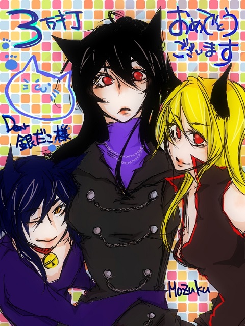 もずくさまより、三万打のお祝いをいただきました!! もずくさまのお子様、猫利さんとほむらくんに、我が子キリーです!! 可愛い子達に囲まれて、うらやましい……。 キリーは相変わらず憮然としていますが、照れ隠しです(笑) もずくさま、ありがとうございました!!