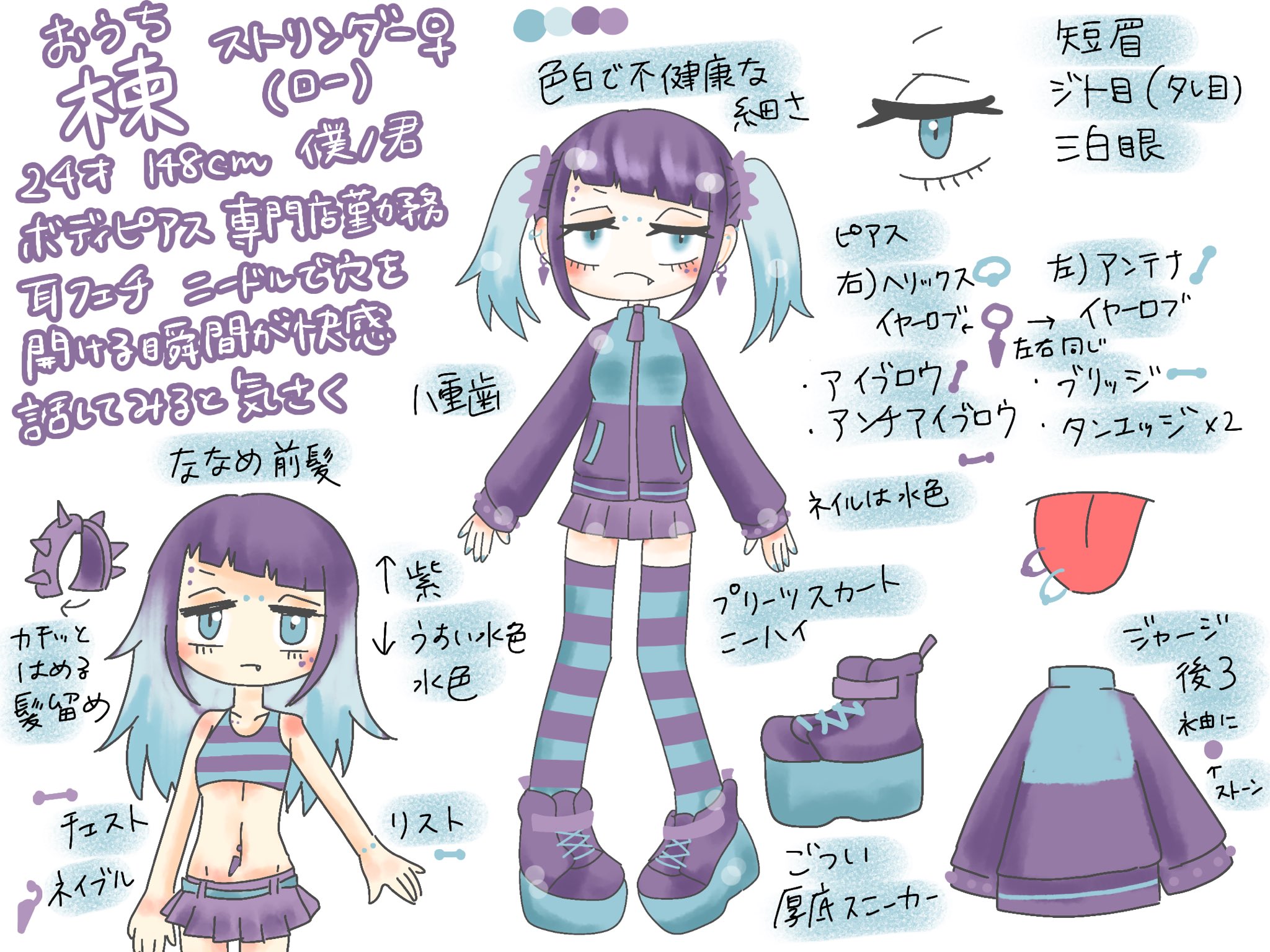 色白で不健康な細さ。三食お菓子で済ませがちな偏食。顔のピアスと目つきの悪さで近寄り難さがあるが、話してみると気さく。
