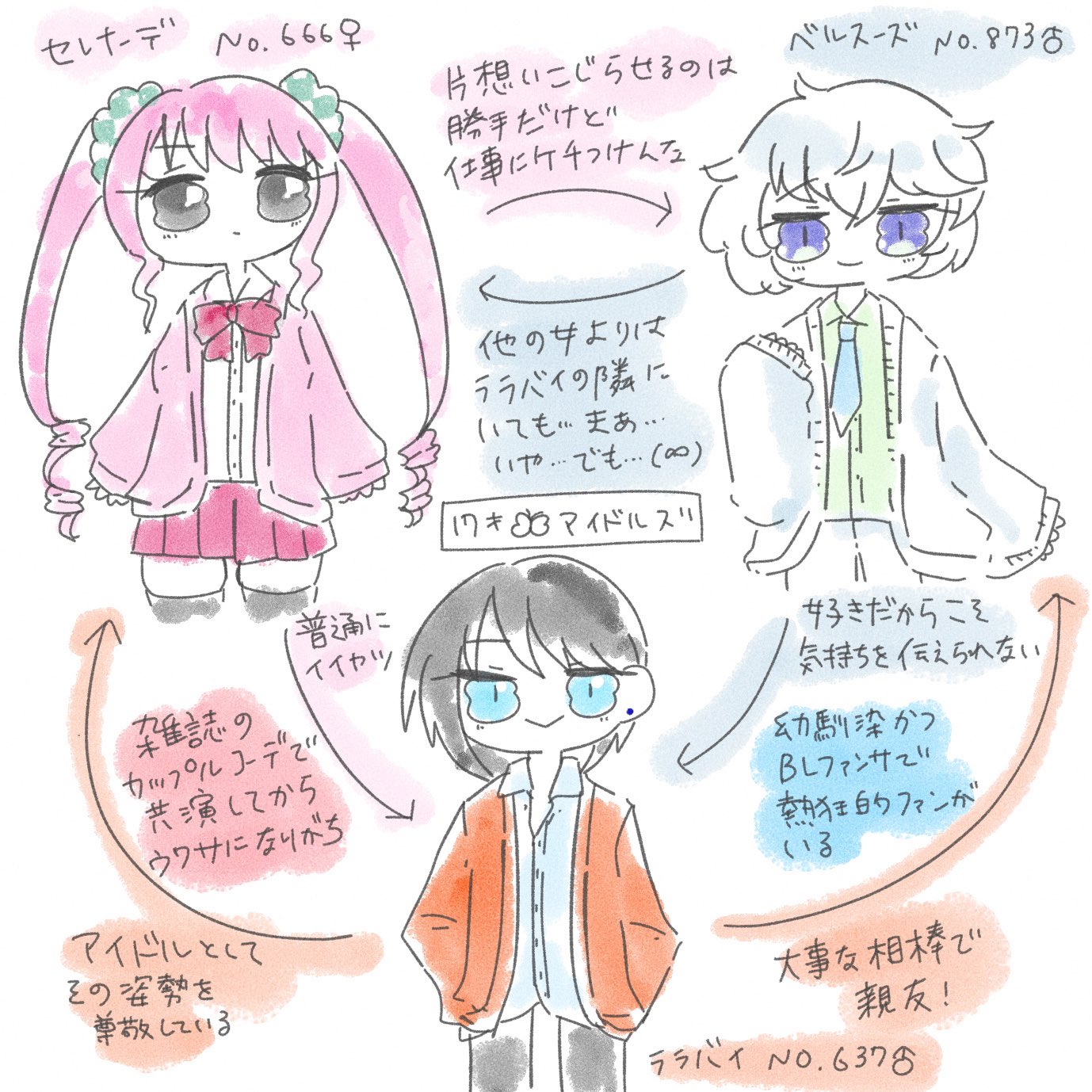 幼馴染のララバイ(ウルガモス♂)に恋愛感情を持っている。他の女に盗られたくないから、色目を使う女は全員自分が抱く。でもララバイには抱かれたい。拒絶されるのが怖いから、自分の気持ちを伝える事はない。彼にとって1番のパートナーとしてずっとそばにいるだけでいい。