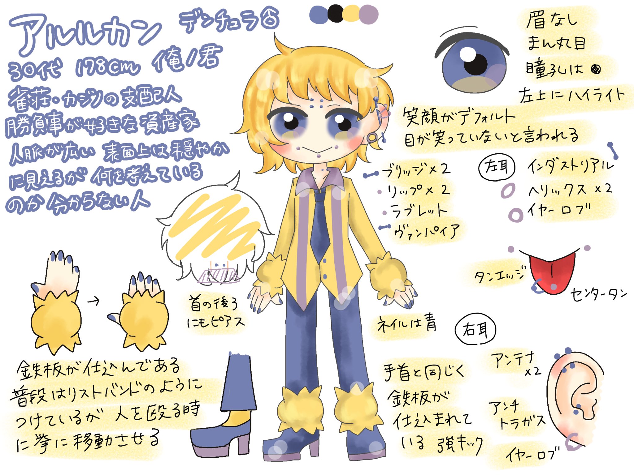 勝負事が好きで、最近は専ら麻雀漬け。けっこう負けず嫌い。表面上は穏やかで優しい口調で話すが、目が笑っていない。顔面ピアス。
