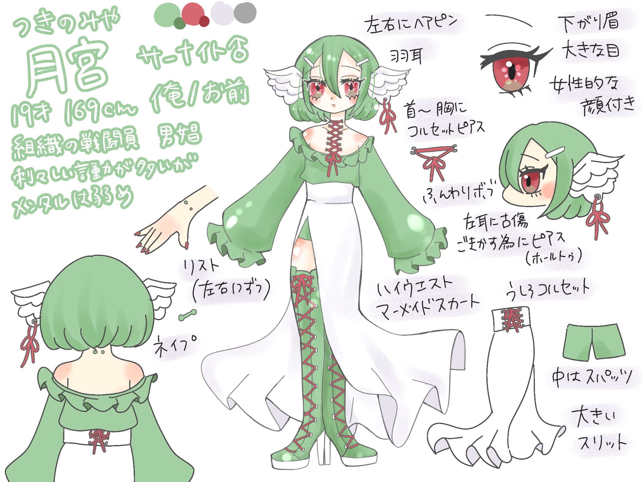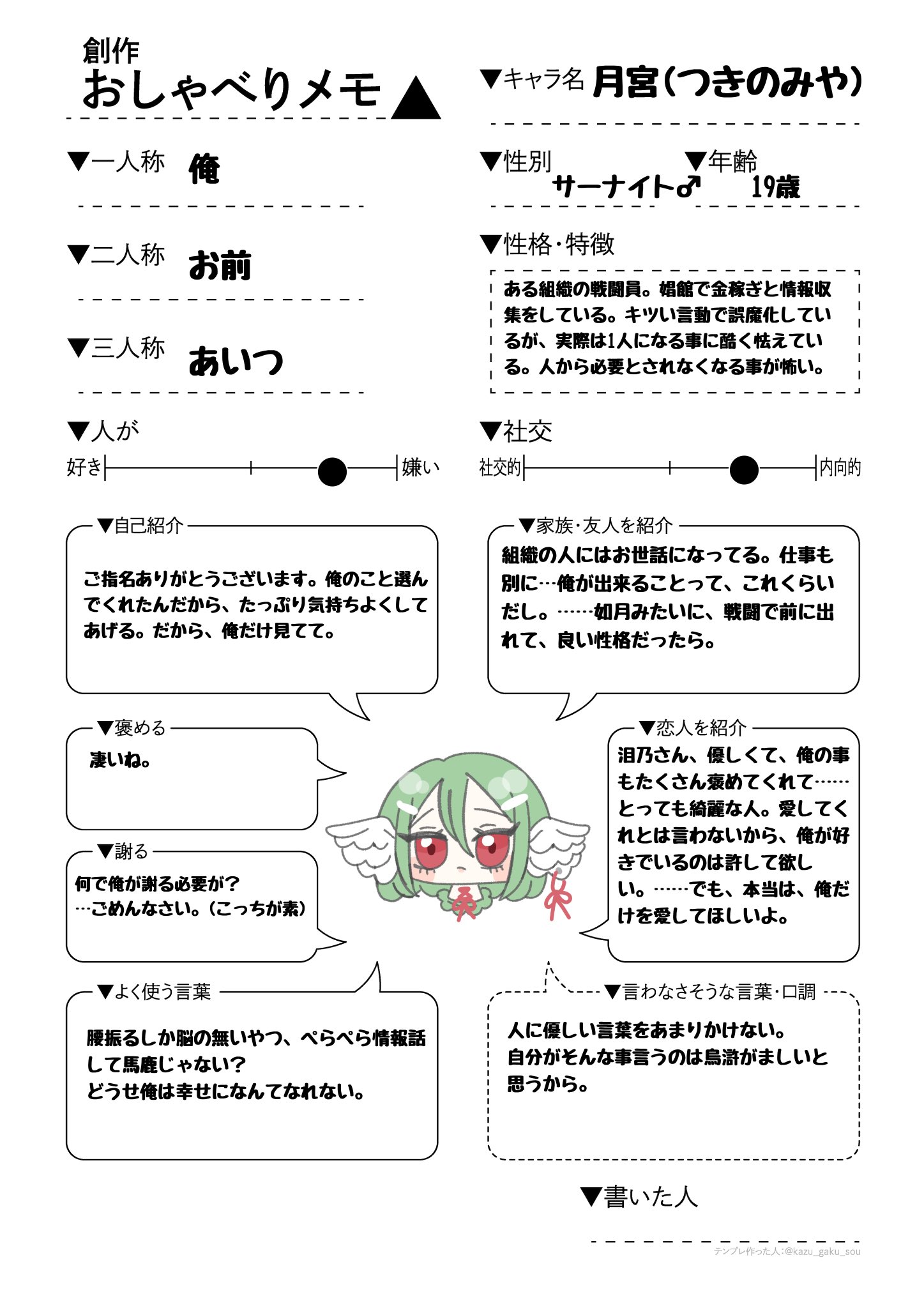 羽耳。組織の戦闘員。娼館で金稼ぎと情報収集をしている。女性的な容姿で線が細いが、護身術程度の戦闘力はある。刺々しい発言が多く、強い言葉で誤魔化しているが、実際は1人になる事に酷く怯えている。人から必要とされなくなる事が怖い。自分の行動をわかりやすく評価してもらえる今の組織は居心地が良いが、自分1人だけを見てくれる相手がほしい。