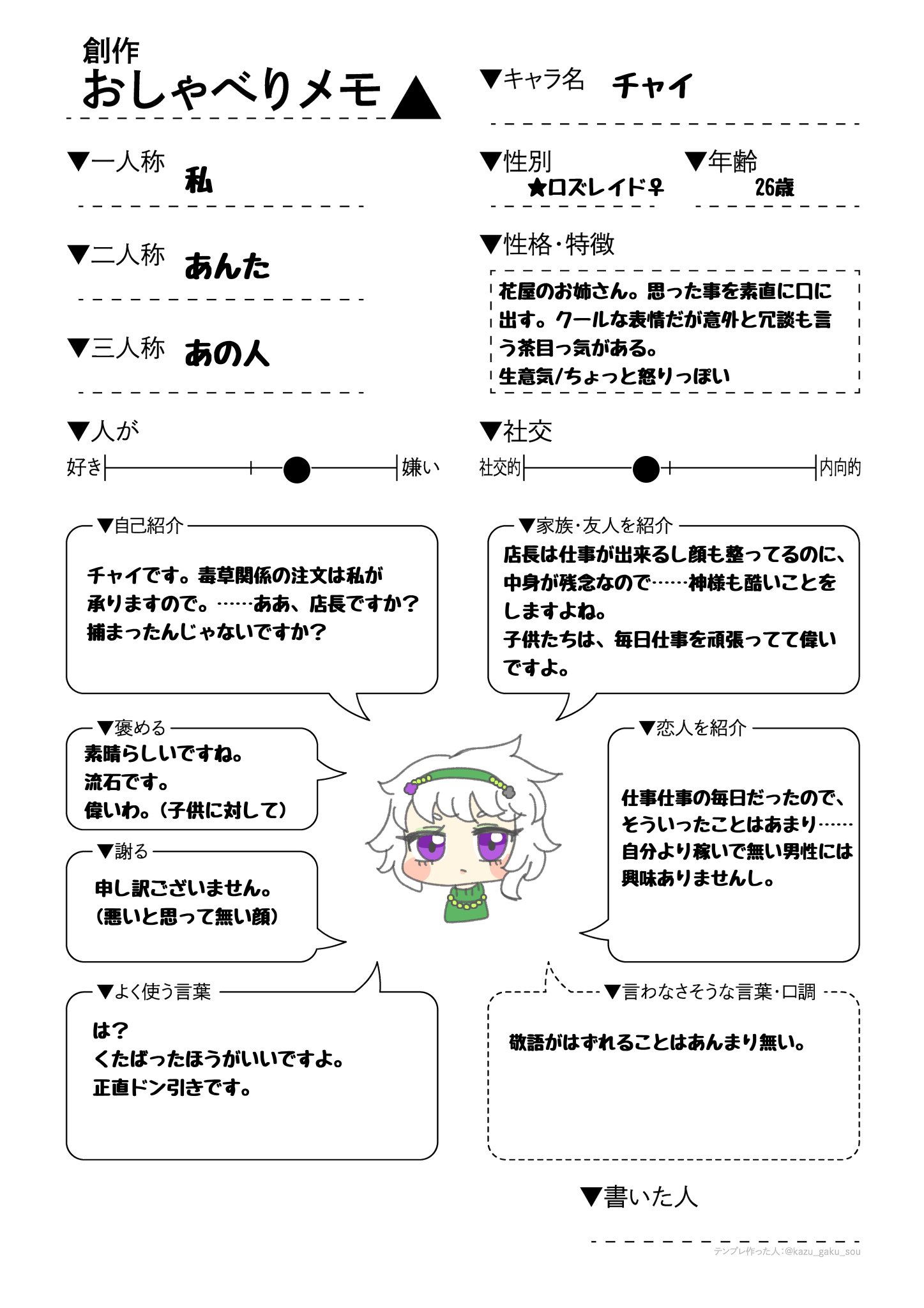 元々セージ(★フライゴン♂)と同じ会社で働いていた。飲みの席で開業の話を聞き、冗談で「この会社より倍なら働いてもいいですよ」と言ったら、それ以上の給料を提示され引き抜かれた。花は好きだし、しっかり報酬を貰えるなら細かいことは気にしないけど、セージの悪癖には正直ドン引きしている。