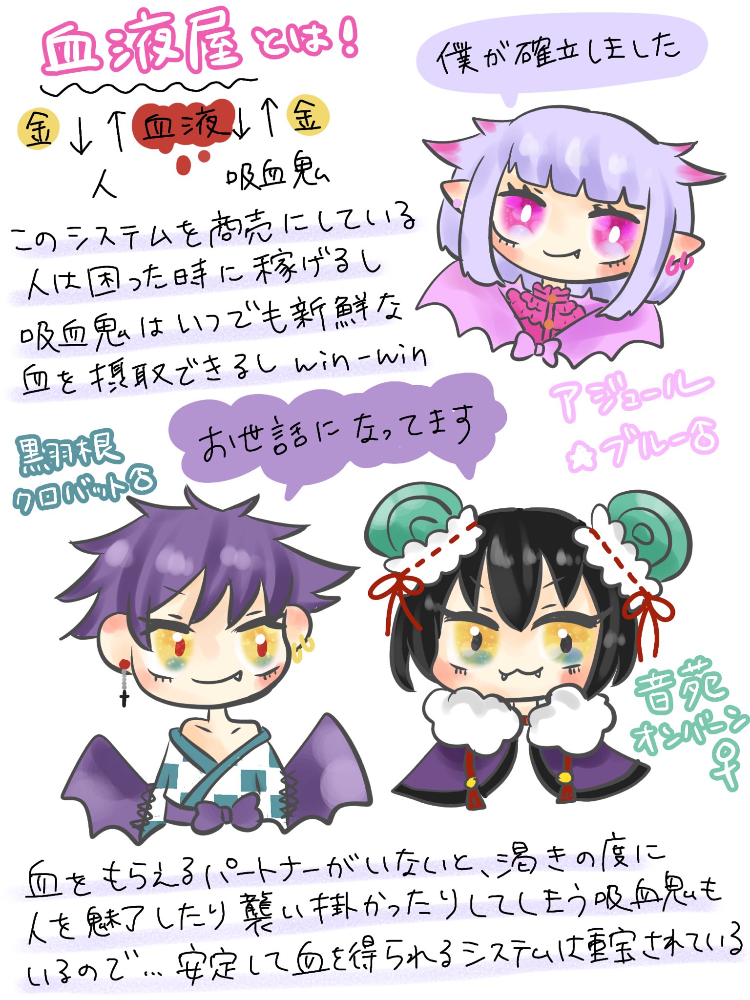 魔法使いの一族から生まれた吸血鬼。血液屋の立役者。まともな働き口が少ない下層で、日銭を稼ぎたい人から血を買い取る商売を確立した。種族柄血液を必要とする人達に重宝されている。