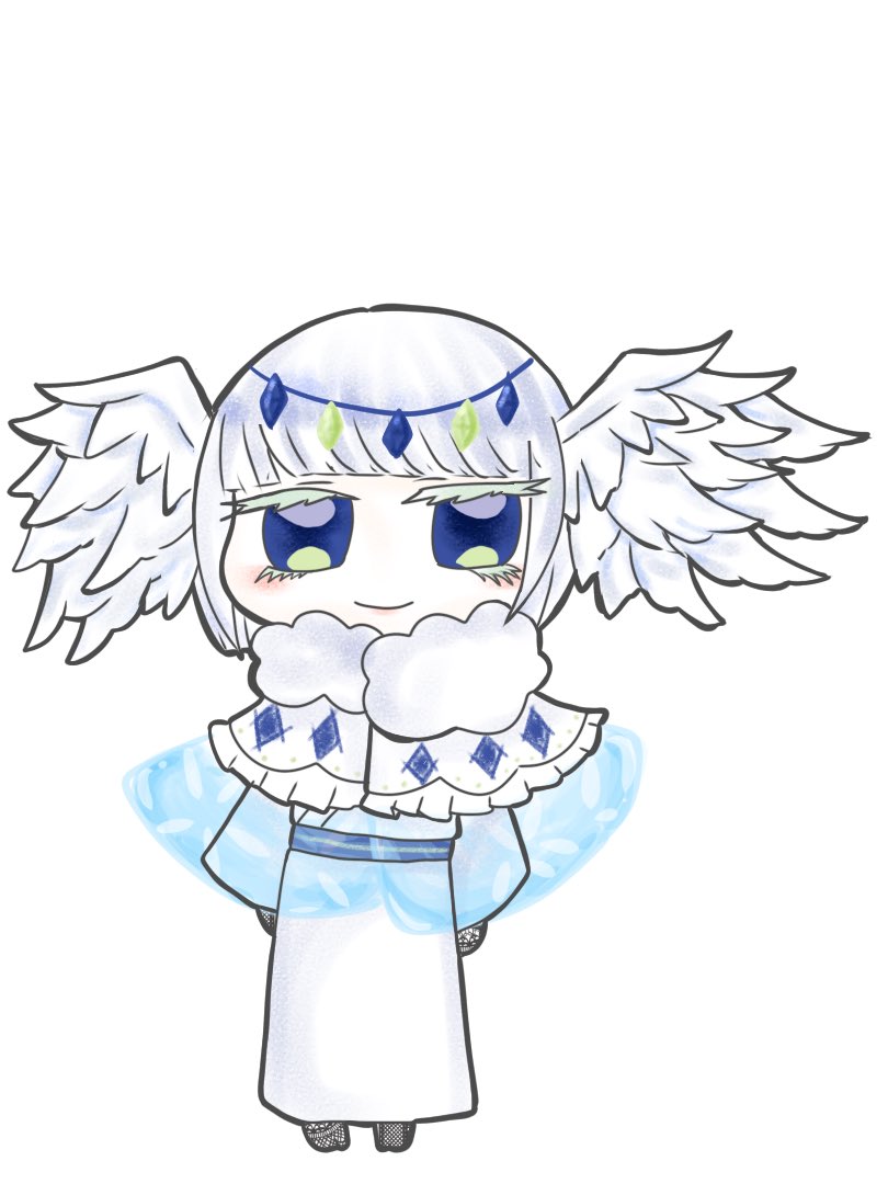 雪景色に溶けてしまいそうな美しい青年。羽耳。宝石のように輝く目は何も見えないが、その代わりに耳と手の感覚が鋭い。