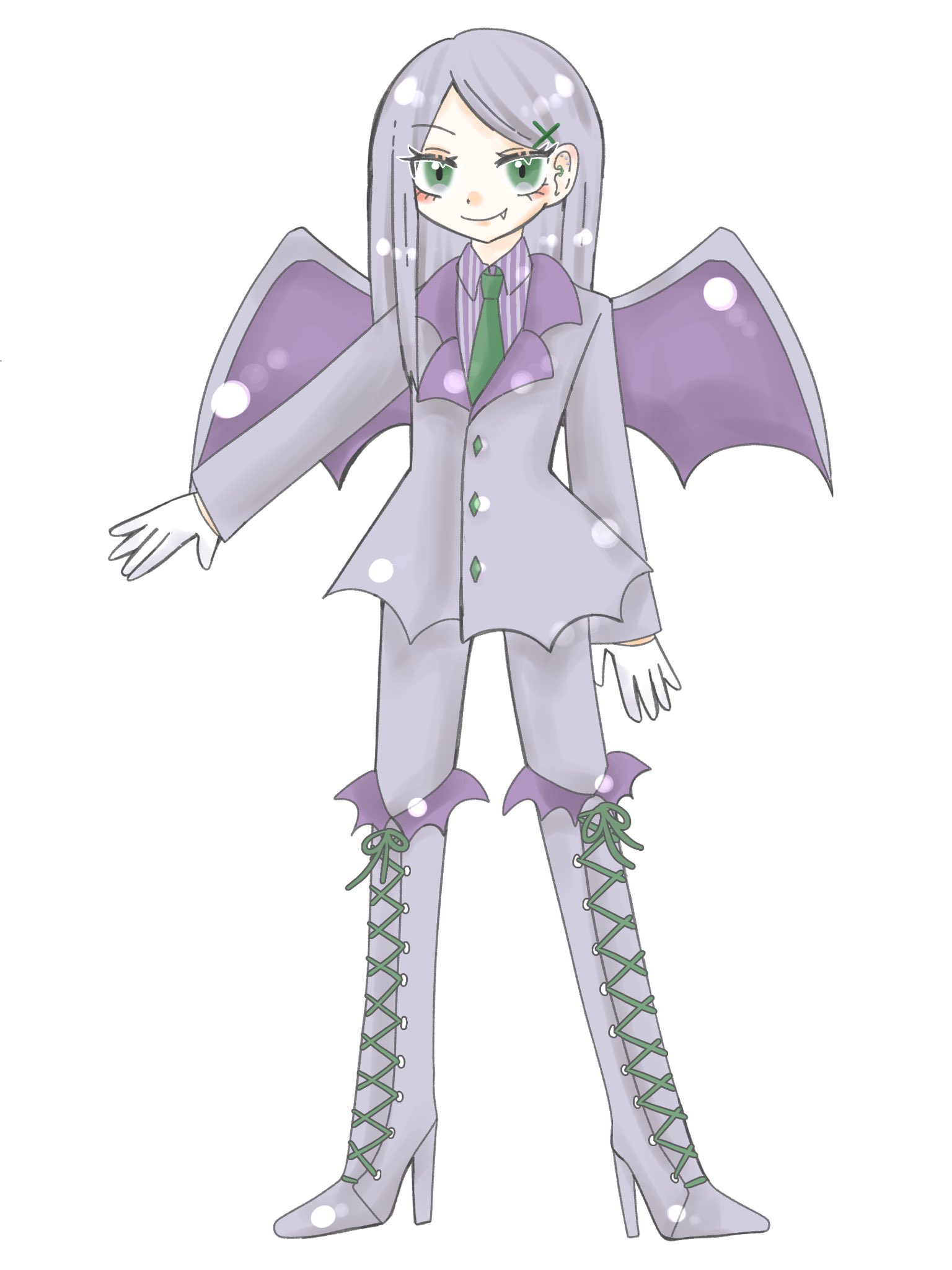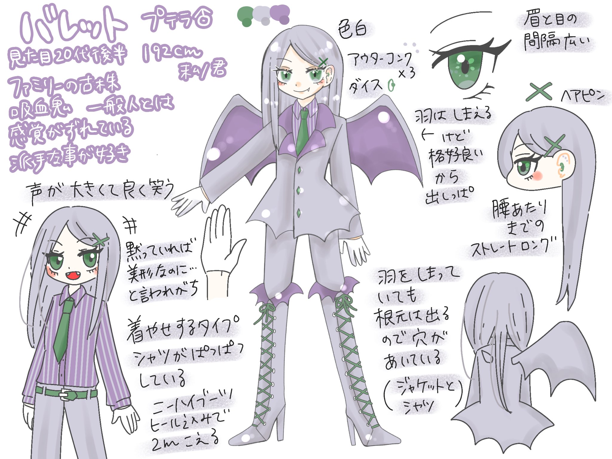 長く生きていて知識も豊富だが、少し一般人とは感覚がずれている。棚の端から端まで商品を購入したり、少額の支払いで万札を出し釣りは要らないと言ったり、金銭感覚がおかしい。派手な事が好き。羽はしまえるけど出してる方が派手だし目立つし格好良いから出す。声が大きく良く笑う。楽しく生きて楽しいまま死ぬのが今の目標。その為に邪魔なものは容赦なく切り捨てられるタイプ。アジュール(★ブルー♂)とは同年代でよくお茶をしており、血液屋へ出資している。