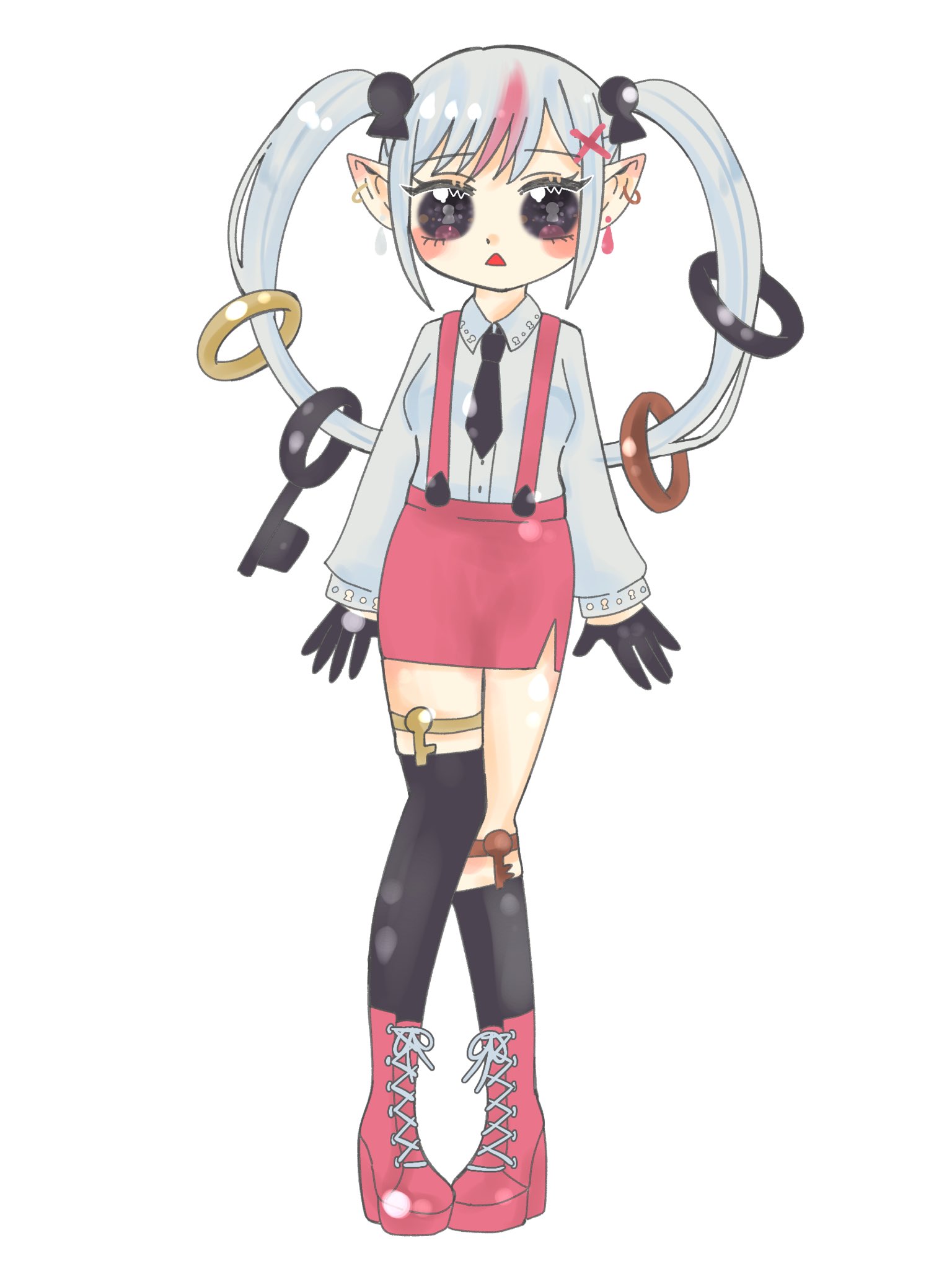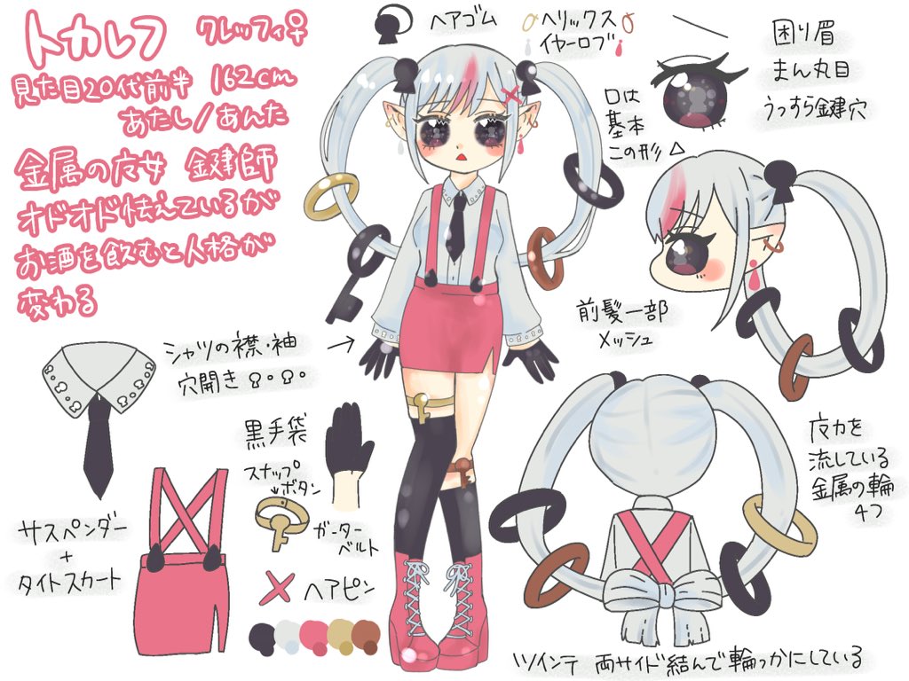 金属の魔女。常に魔力を流している髪飾りを、檻の解錠をする鍵やロープを切るナイフなど、好きな形に変えられる。バレット(プテラ♂)の友人で、彼の推薦で鍵師として仕事を請け負っている。いつもオドオドしている。マチルダ(マフォクシー♂)が嫌う"亜人ではない人"なので、機嫌を損ねないように出来るだけ気配を消しているが、度々ドジを発揮し冷たい目で見下ろされている。怯え様があまりにも哀れで、それ以上怒られることはない。お酒を飲むと人格が変わる。