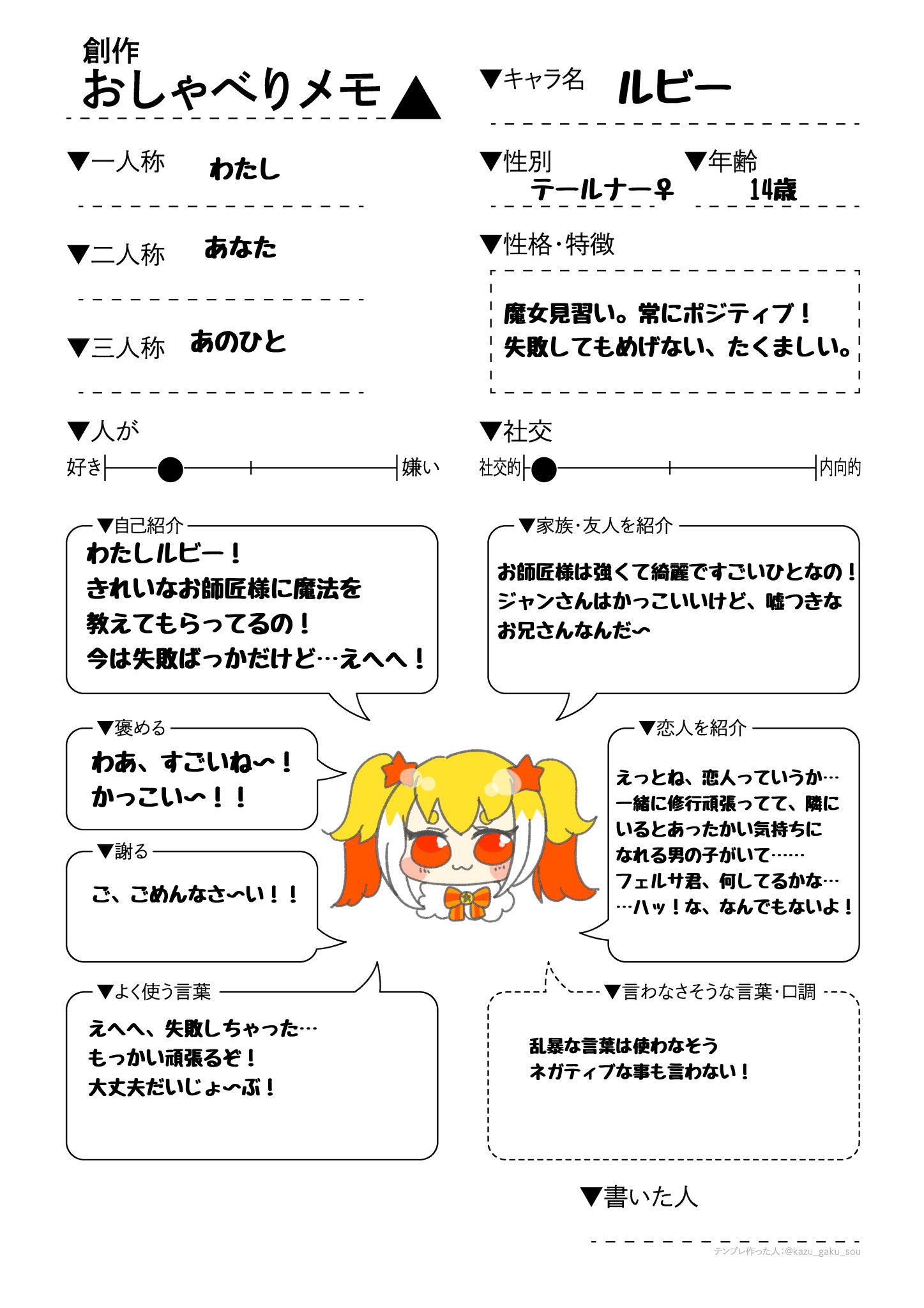大魔王×魔女というフェルルビちゃん!森で修行中に出逢ったフェルサ君は、ルビーに的確なアドバイスをしてくれて、いつもお世話になっている。お返しにお菓子やお弁当を差し入れすると、いつも綺麗に食べてくれるのでルビーはニコニコ!フェルサ君が煙草を吸っている時は、飴を渡されてちょっと離れたところに待機させられるのが、ちょっと寂しい…。