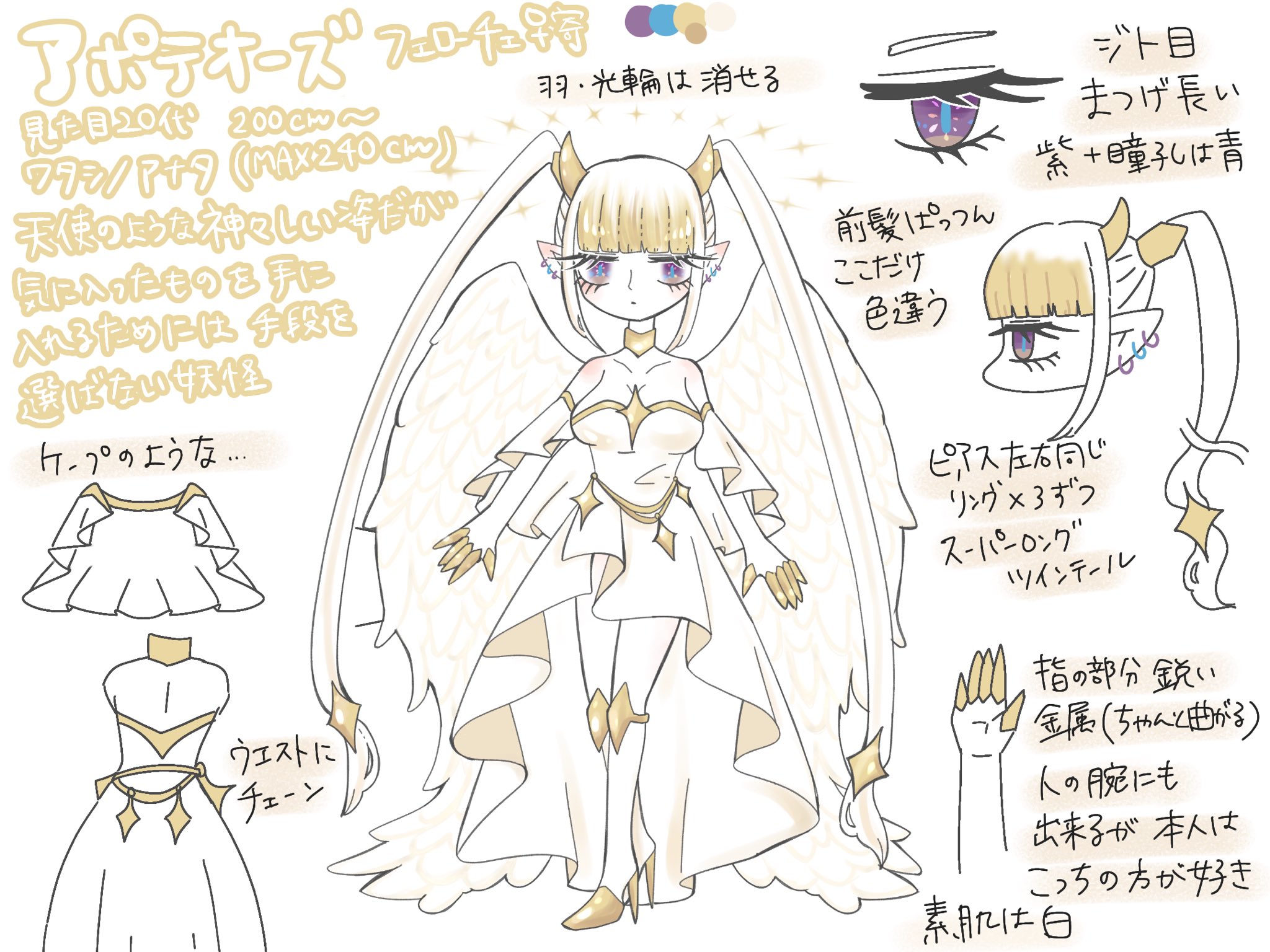 2mを超える背丈に大きな翼を持ち、天使のような姿。その本性は気に入ったものを手に入れるために手段は選ばない妖怪の類。惚れっぽくて飽きっぽい。美しい物、高貴な物が好きで、主に上層をふらふら漂っては気になった物、人を攫う。元の場所に返すか、その辺に捨てるかは彼女の気まぐれで決まる。