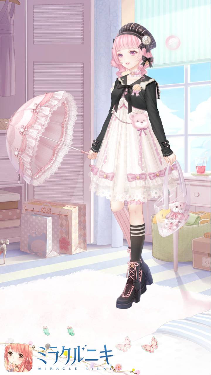 可愛い白とピンクに黒のアクセントが映えた、病み可愛さのあるコーディネート。