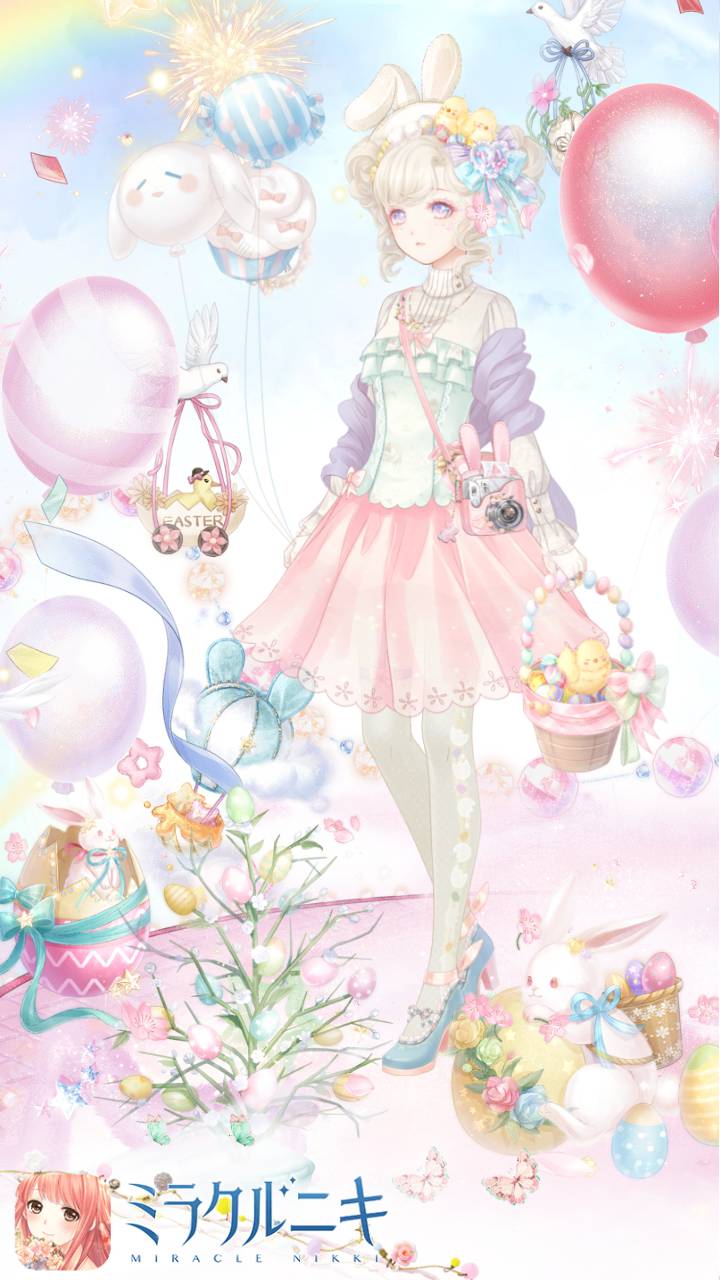 うさみみに合わせたアイボリーの髪とトップスと、手持ちのカゴに合わせたパステルカラーのアイテムたちで派手過ぎずシンプルになりすぎない感じに。