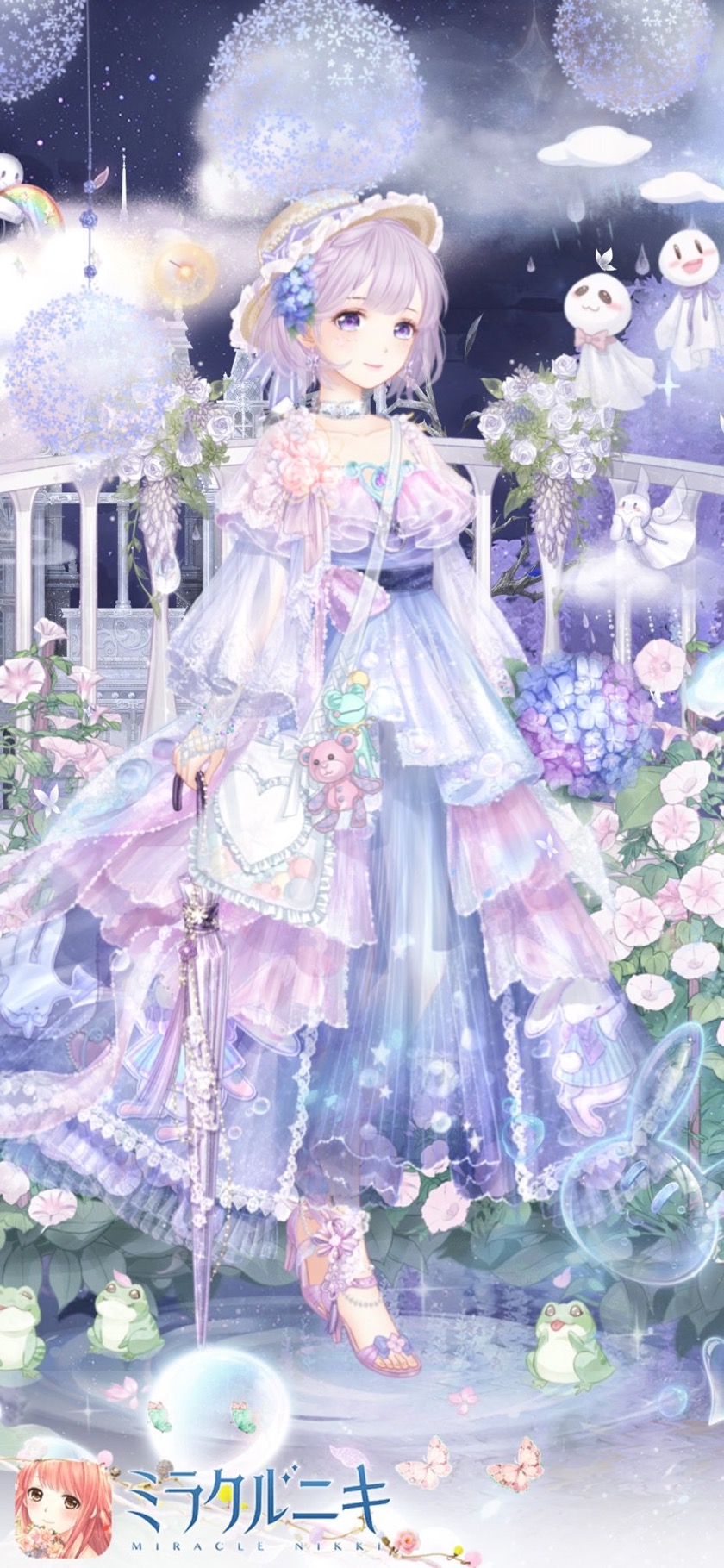 ドレスは紫陽花のようなカラーリングのものを選んでます。模様のうさぎさんに合わせて顔にもうさぎさん。