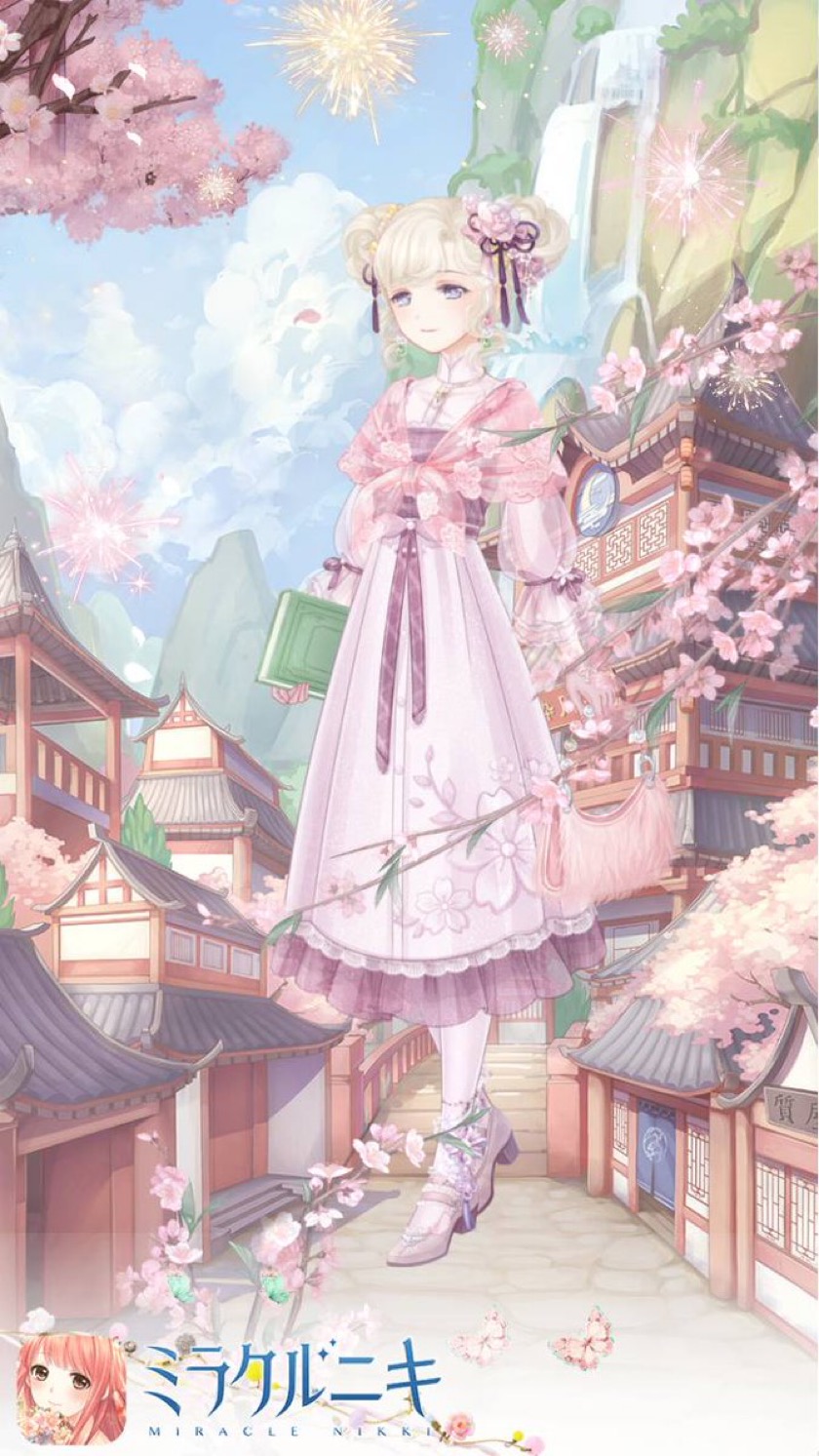 桜モチーフをメインに花アイテムを使った雲上コーディネート。淡めの色合いと優しい瞳メイクで柔らかな雰囲気に。
