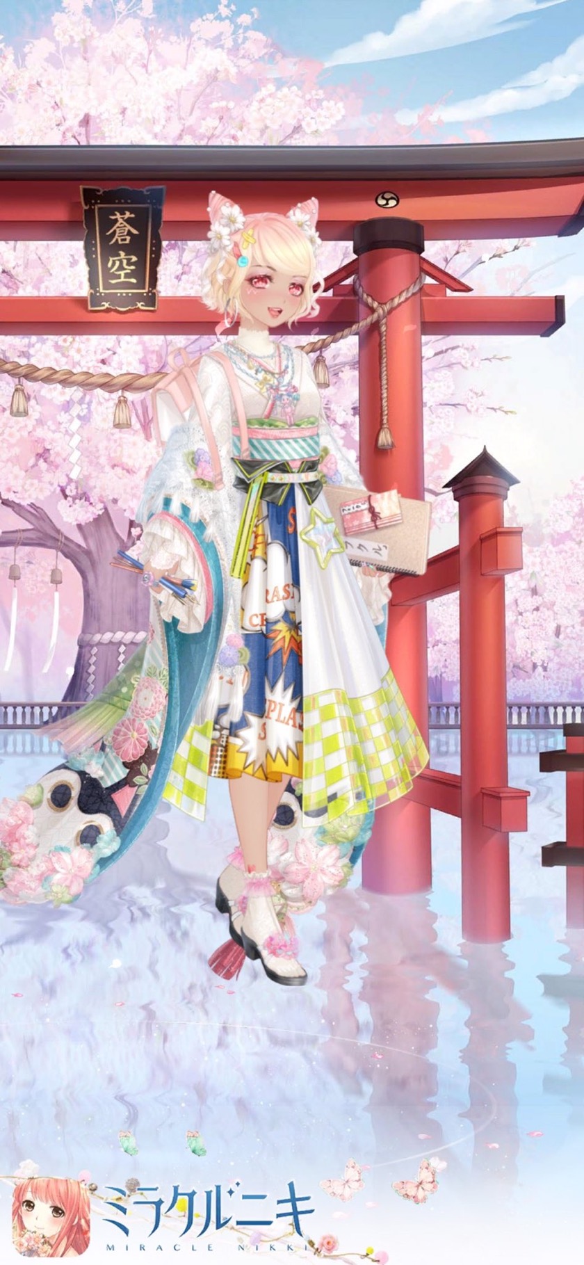 サブカル感ある和ポップコーディネート。カラフルでもゴチャつかないよう白メインで色物アイテムは出来るだけ似た色彩の物を選んでみました。