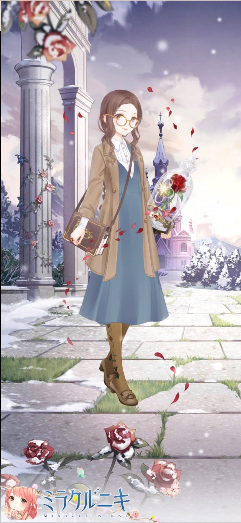 靴下に薔薇モチーフアイテムを用意。本の鞄でベルらしさも出してます。