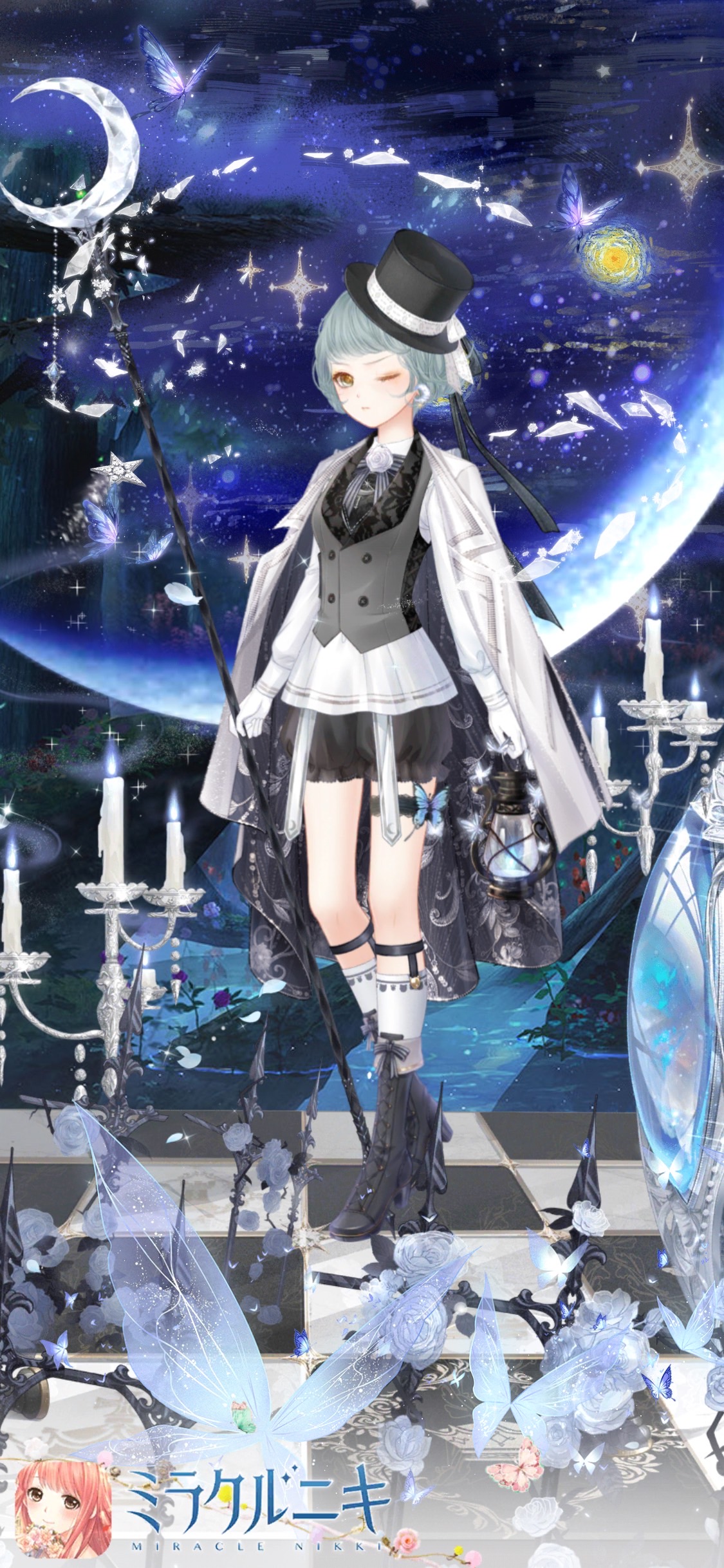 マニッシュな雰囲気のモノトーンコーディネート。青い蝶がワンポイント。