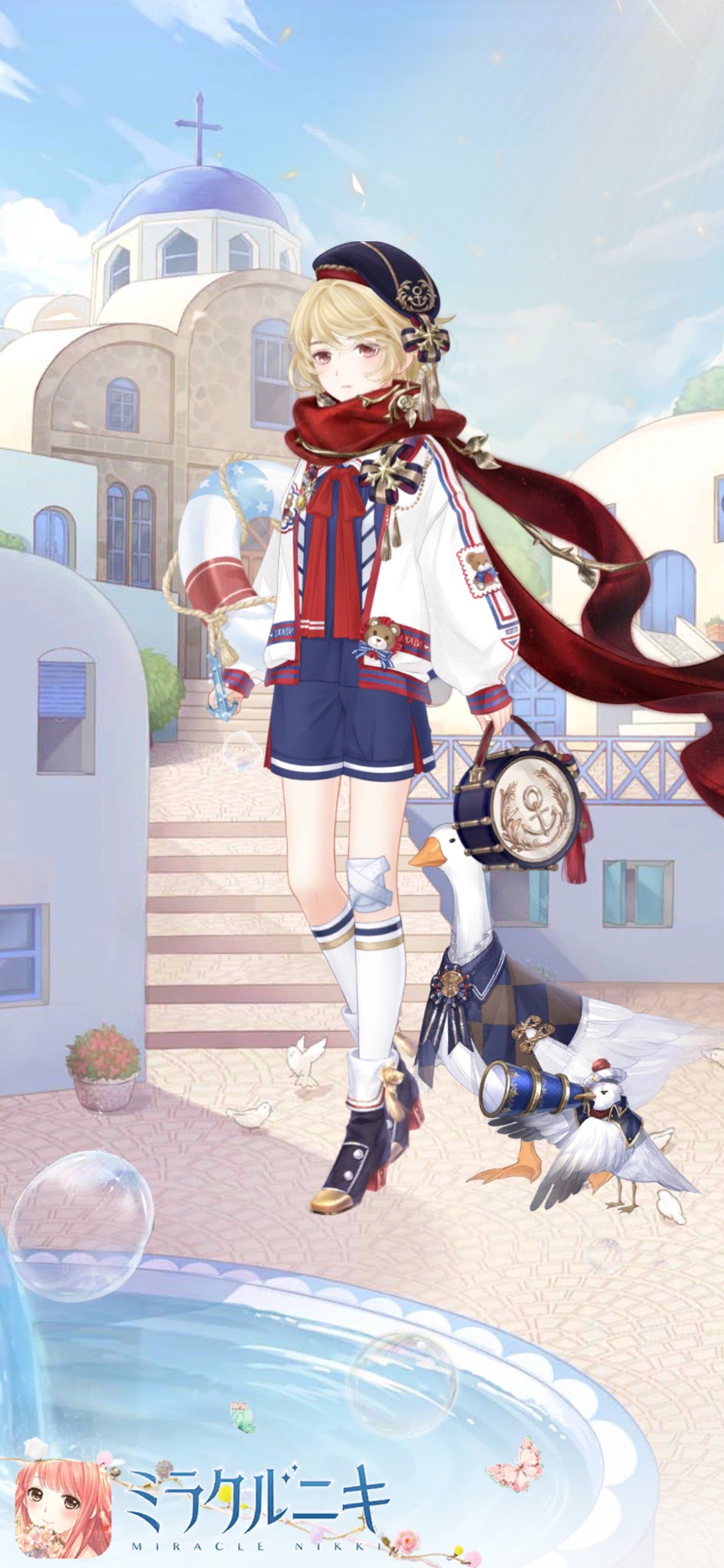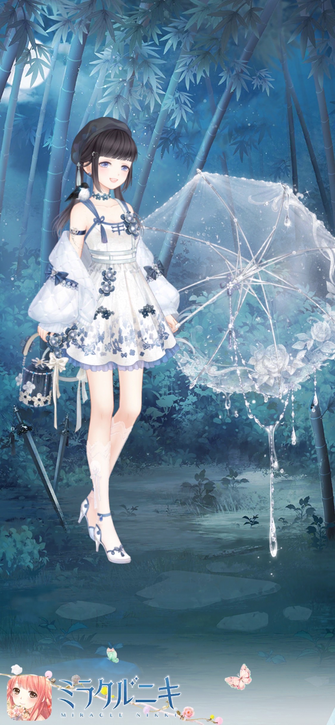 ホワイト・ブルー系の色且つ花柄のアイテムを使ってます。コートや腕のアイテム等でイマドキ感を出しつつ基本はモダンチャイナ。