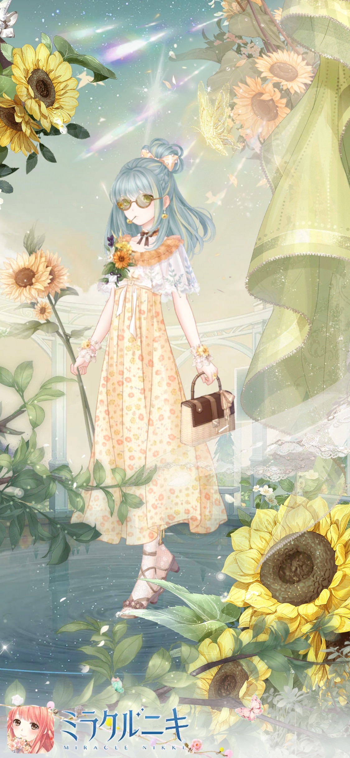 向日葵を中心に花アイテムを多用。色も向日葵カラーで元気にし、ナチュラルなブラウンアイテムでしめてます。