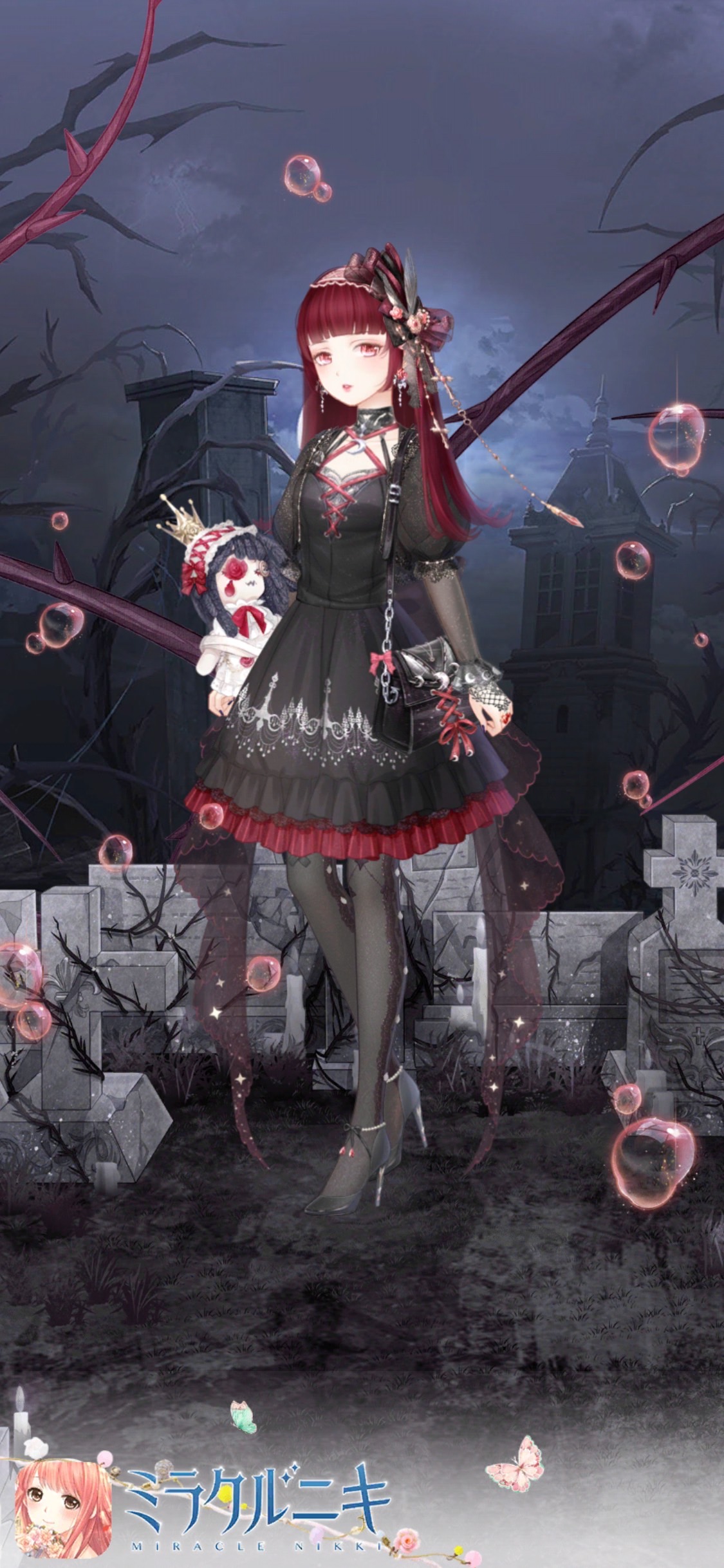 アウターで少しだけ露出を減らし、カチューシャ枠に頭飾りを重ねてヘッドドレスに見立てています。なのでバッグのチェーンにカチューシャ枠に付いてるリボンがくっついてる。