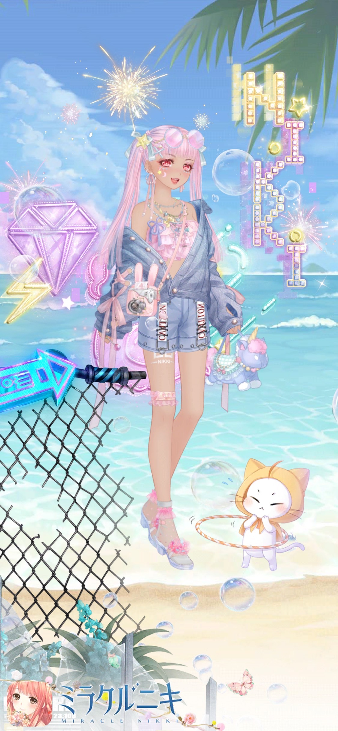 アウターとボトムスをデニム系生地合わせに。デニムの格好良さをゆめかわアイテムで中和。