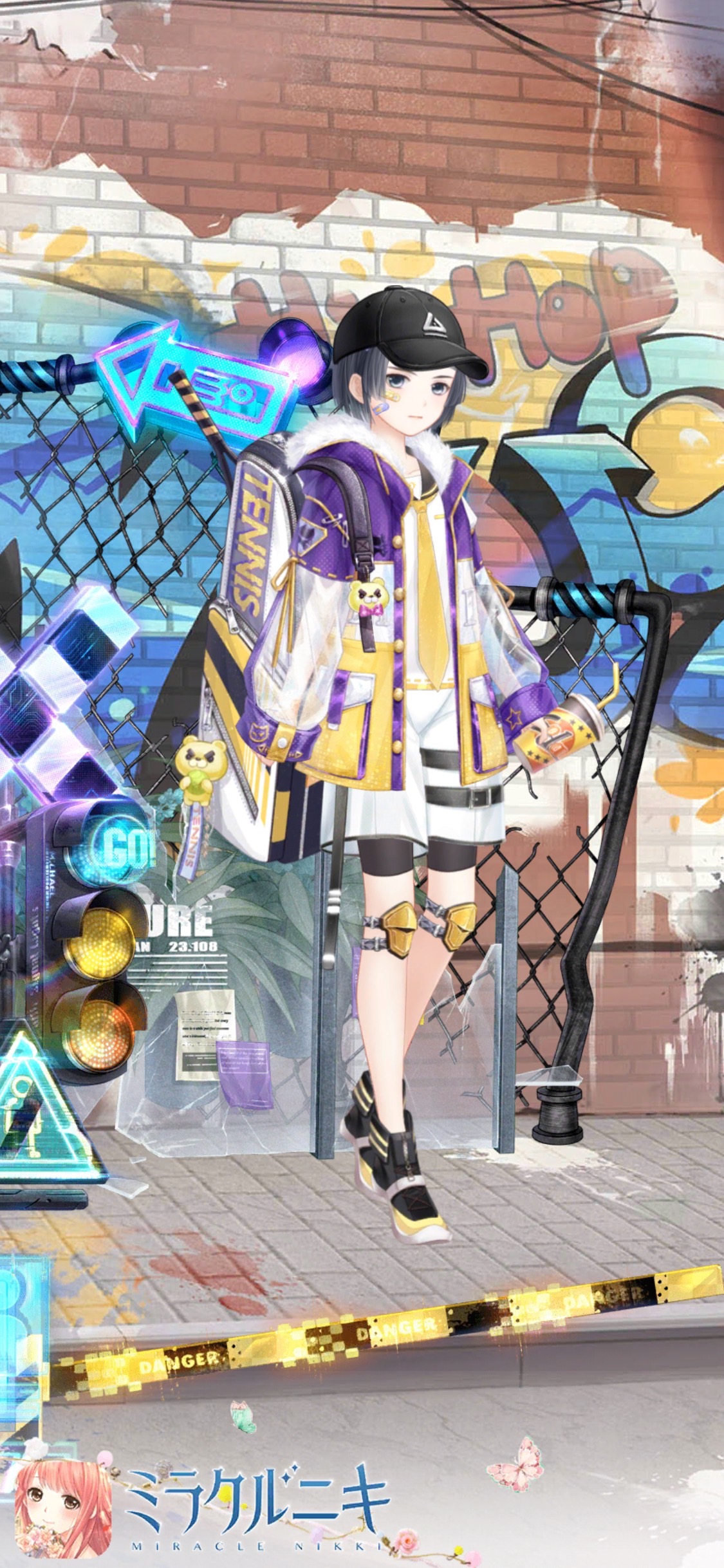 テニス活動する少年風コーディネート。紫・黄色の組み合わせで派手に。