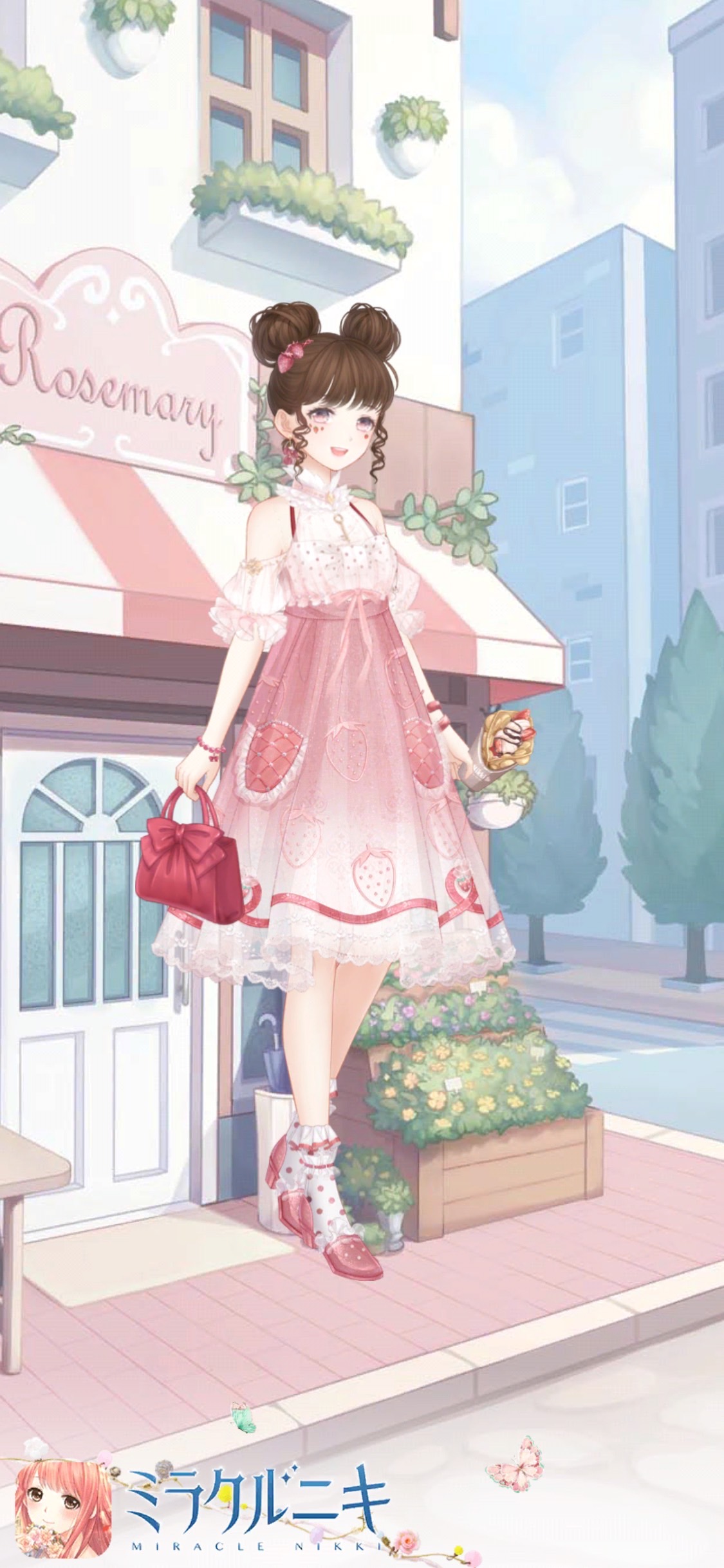 苺アイテムとドット柄アイテムで可愛らしいコーディネートに。