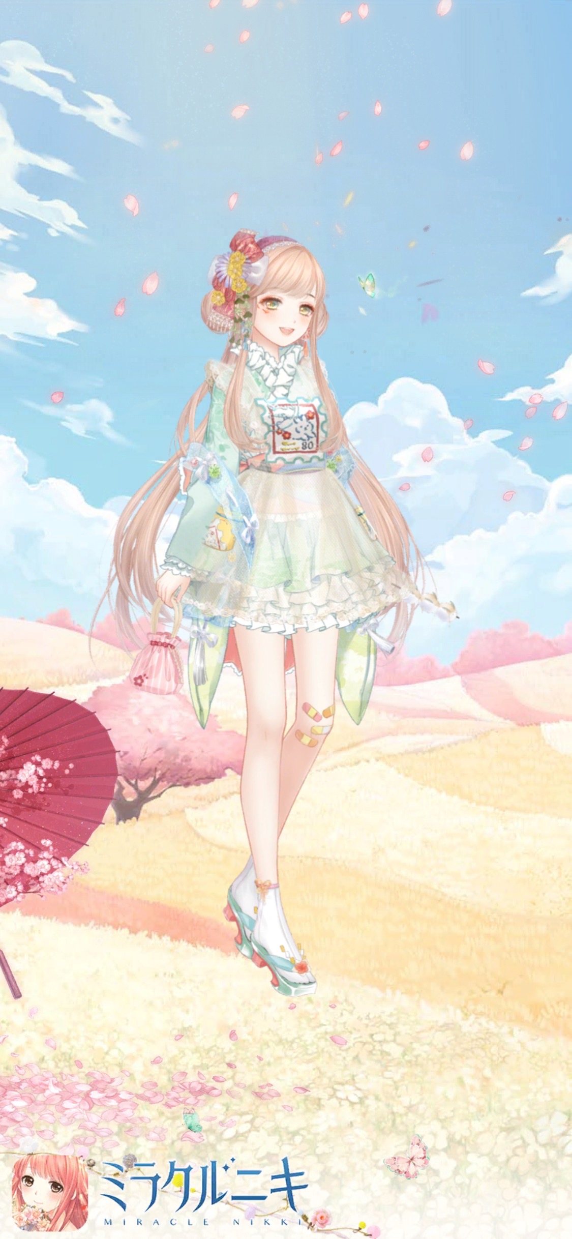 セピアカラーに春色スカートが映える雲上コーディネート。